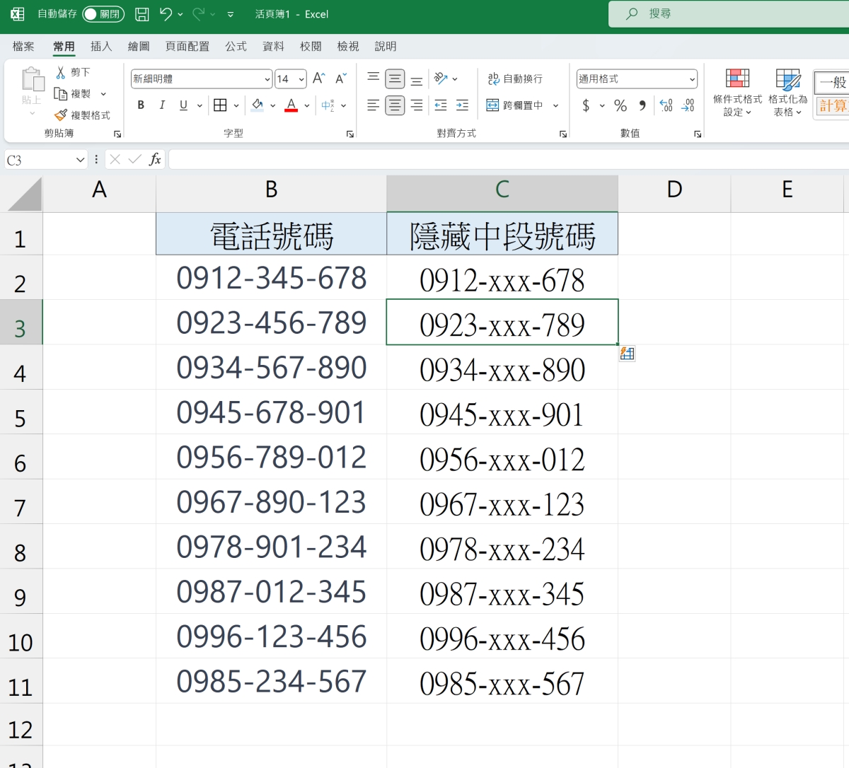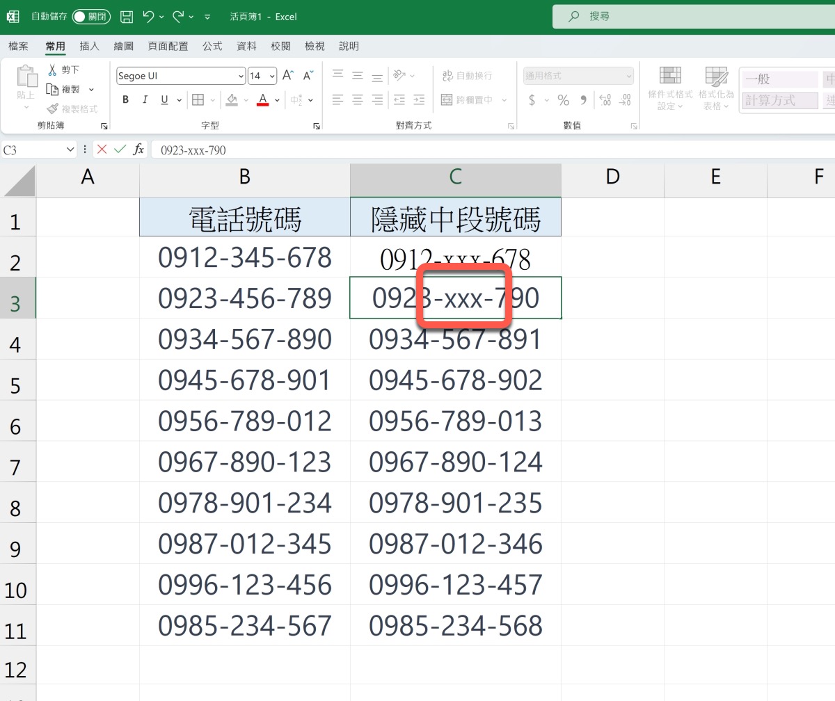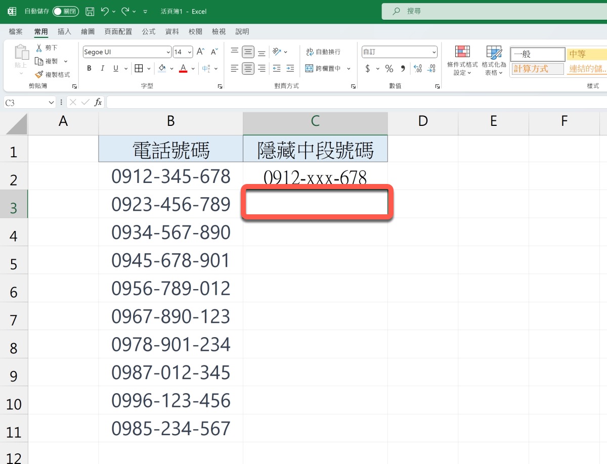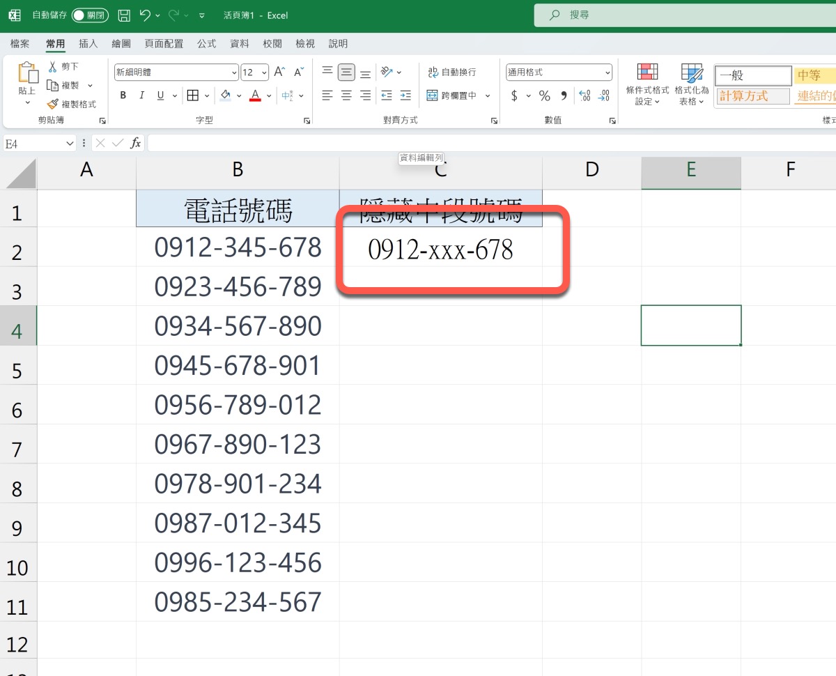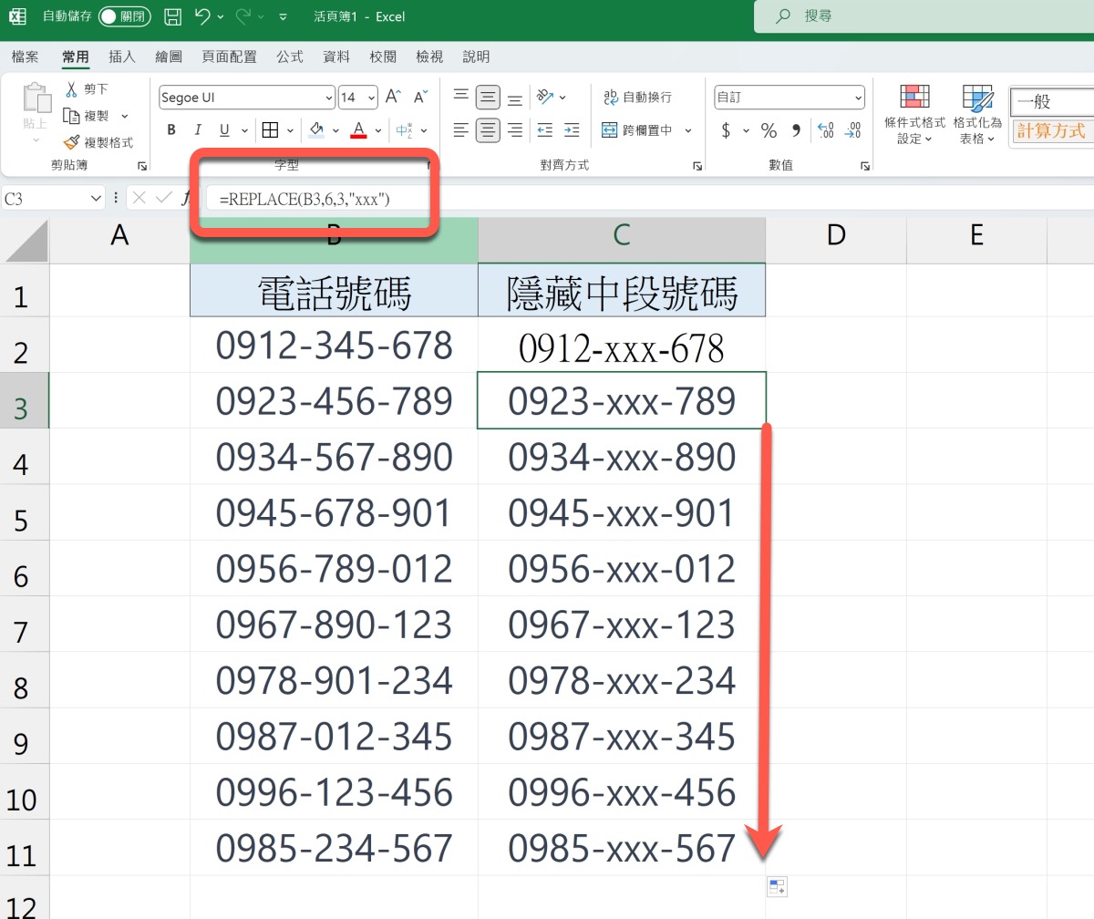 首先,我們用電話號碼來示範,基本上,用地址做法也是一模一樣的,那麼我們要怎麼將中間三碼變成 XXX 或是 OOO 等字樣呢?