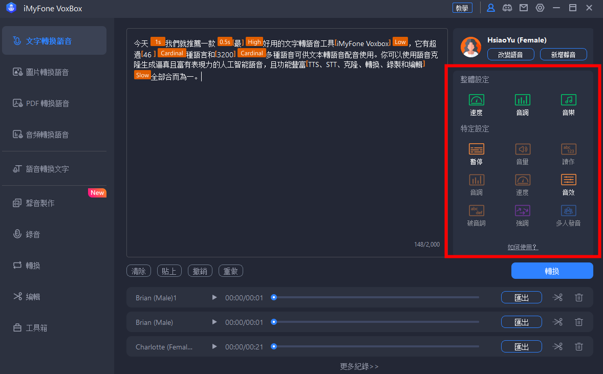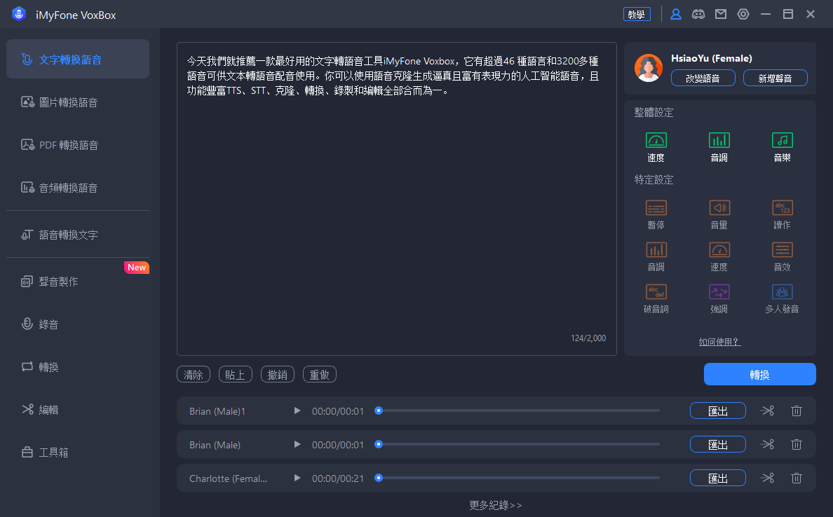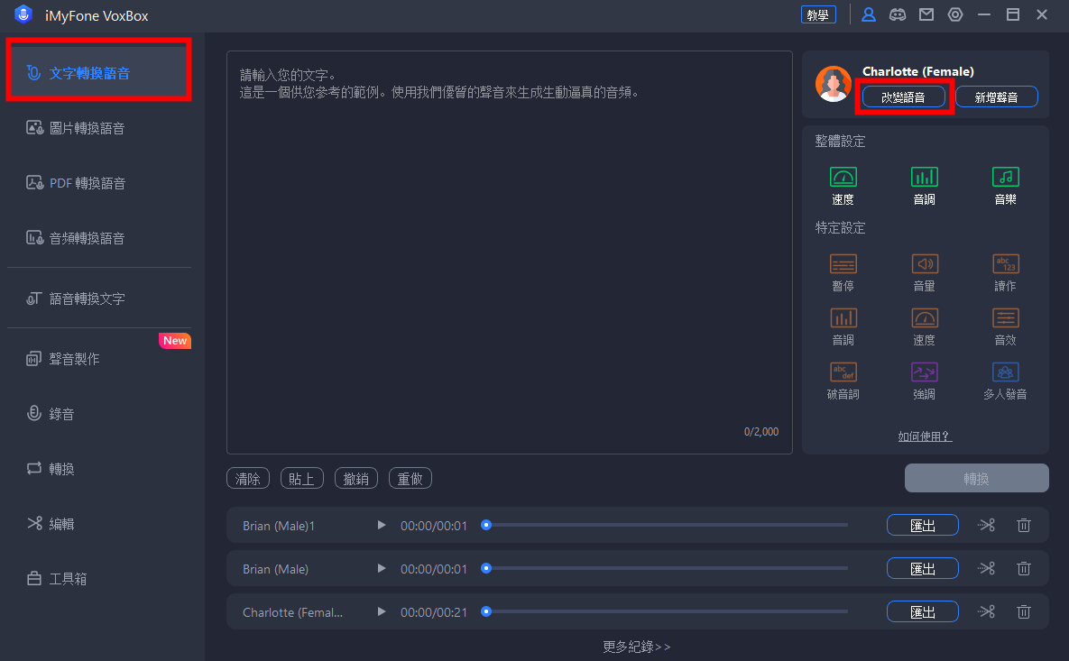 並在文本框內輸入想轉成語音的繁體字,iMyFone Voxbox就會幫你自動生成對應語言的語音了。