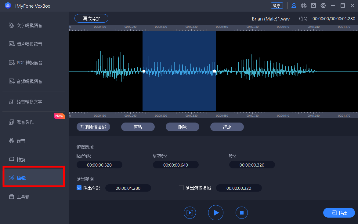 步驟5:如果你對生成的語音不夠滿意,你還可以點擊左下角的「編輯」功能對生成的音頻進行剪貼、刪除和復原等操作,不需要再匯出軟體外進行二次操作。