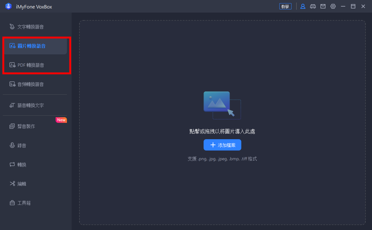 步驟6:如果您的文字是圖片格式或是PDF格式也是完全沒有問題的!點擊主界面左側的「圖片轉換語音」或「PDF轉換語音」功能,「添加檔案」至軟體內即可快速讀取文檔內的文本進行轉化。