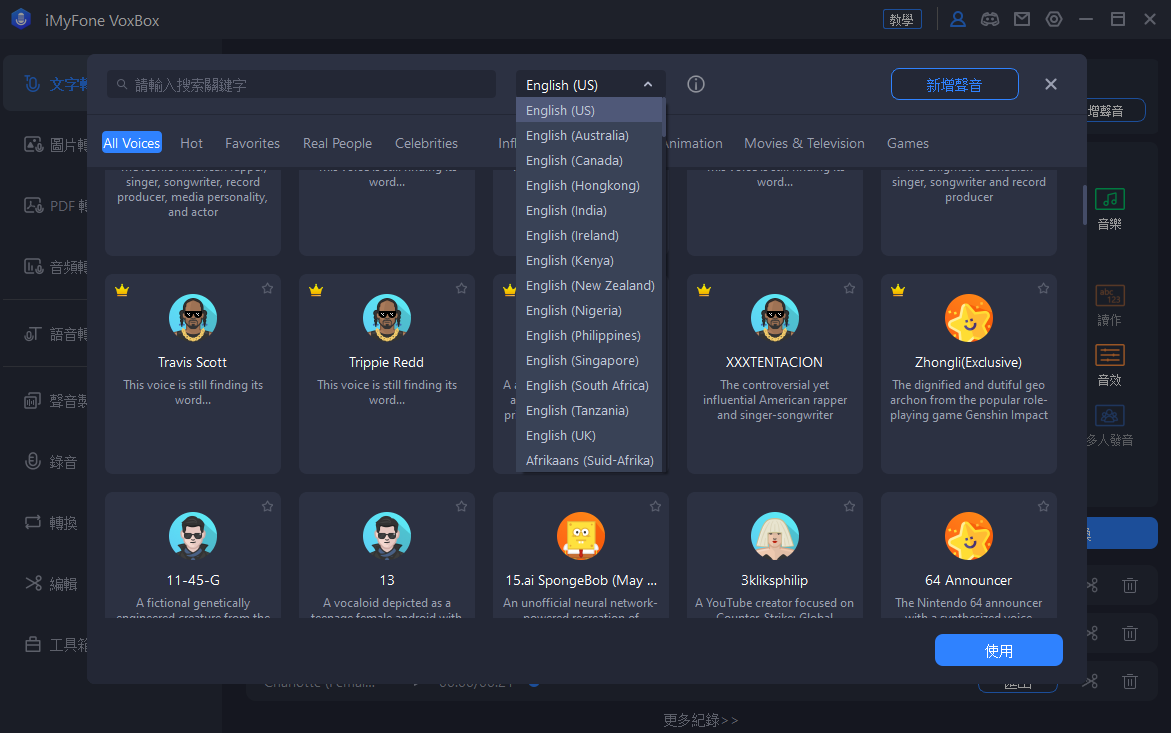 步驟2:選擇「國語(台灣)」或其他任何你想要生成配音的語言類型,再選擇你想使用的聲音效果,有男聲、女聲和其他逼真的音效,選擇完畢後點擊「使用」開始體驗。