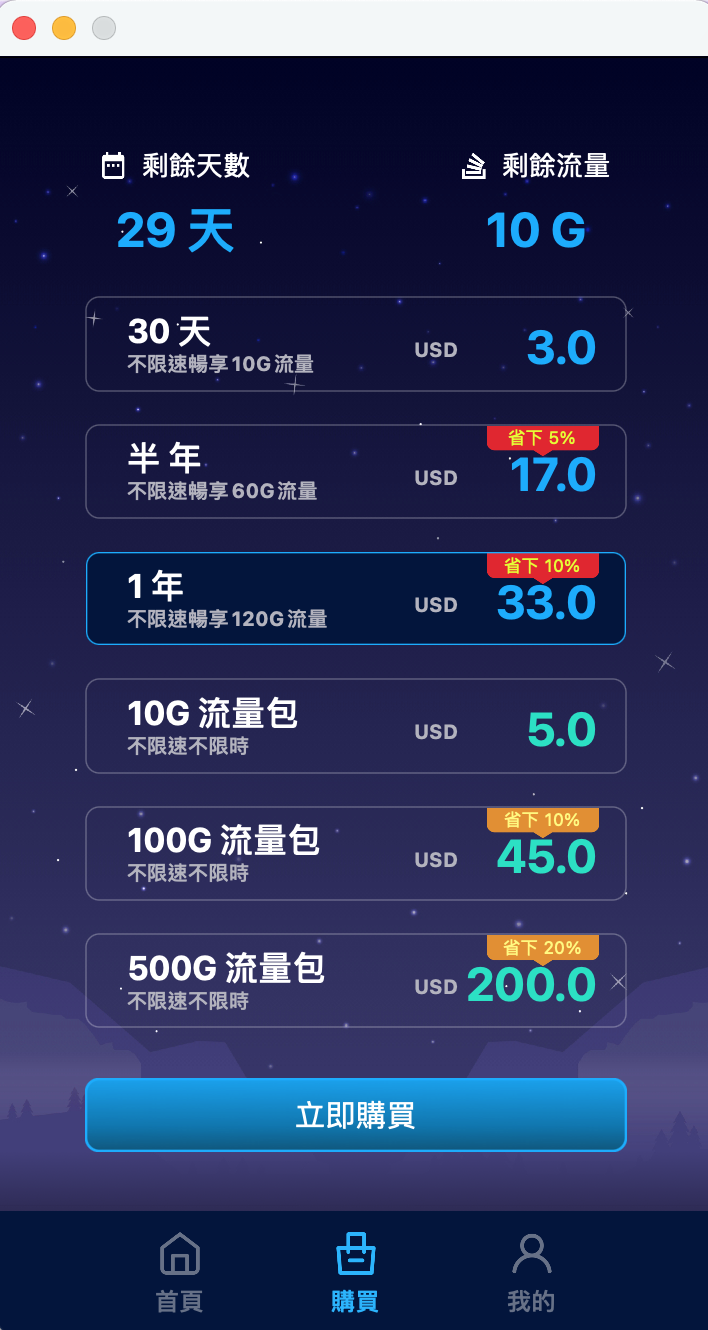 切到第二個分頁,可以看到免費使用的天數跟剩餘流量,而且不用註冊,第一次下載的就會有這些額度可以使用。