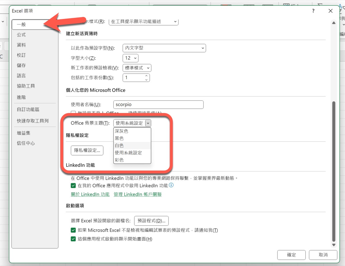 首頁 › 電腦小教室 › Excel 的介面一定要綠色嗎?教你更換 Excel 的佈景主題 Excel 的介面一定要綠色嗎?教你更換 Excel 的佈景主題 發佈日期:2023/10/4 作者:阿湯 分類:電腦小教室 在大家的既定印象,Excel 是綠色這件事應該已經深深的烙印在各位的心裡,不過事實上,Excel 不見得只能是綠色,大多數人不知道內建還有佈景主題的修改功能,在更早期的 Excel 還有一些主題外掛,可以改的很誇張,不過現在 Excel 就有內建幾個基本款色系讓大家去變換,往下來教大家應該怎麼去設定不同的顏色吧。 變更 Excel 的佈景主題教學 打開 Excel 後點擊左上角的「檔案」,然後像我現在這畫面的主題是白色,不是綠色的。 在最下角進入「選項」。 在一般裡往下拉,就會找到 office 佈景主題,這裡修改會一併調整 Word、PPT 的主題,預設為彩色,也就是大家印象中的綠藍橘三色,你也可以單一主題色,比如深灰、黑色、白色或是用系統設定。 像這是黑色。 選擇彩色就會照原本的,如果看膩了就換一個色系吧。