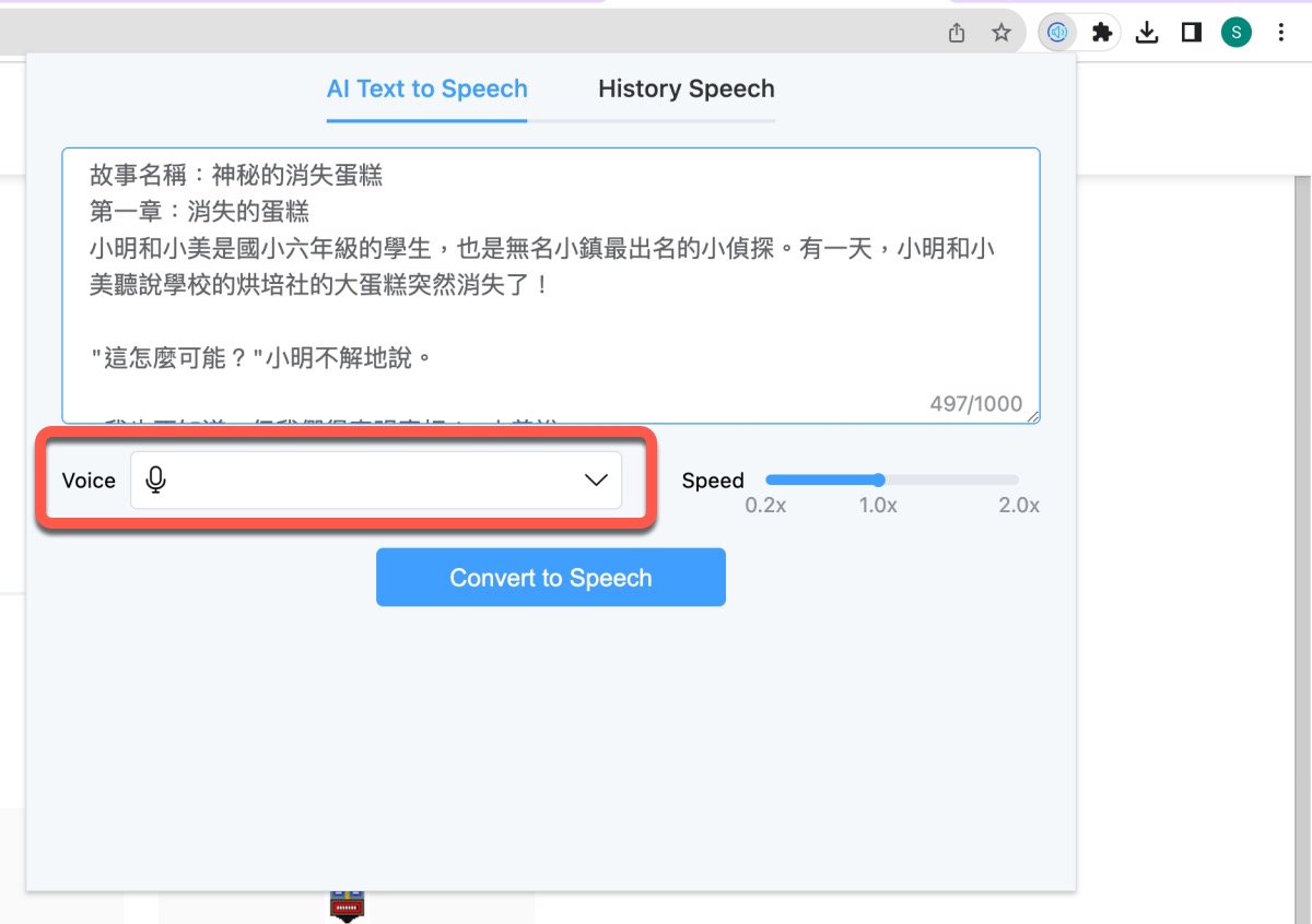 接下來使用很簡單,先貼上你要朗讀的內容後,下方的 Voice 點擊進去選擇語言及語音。
