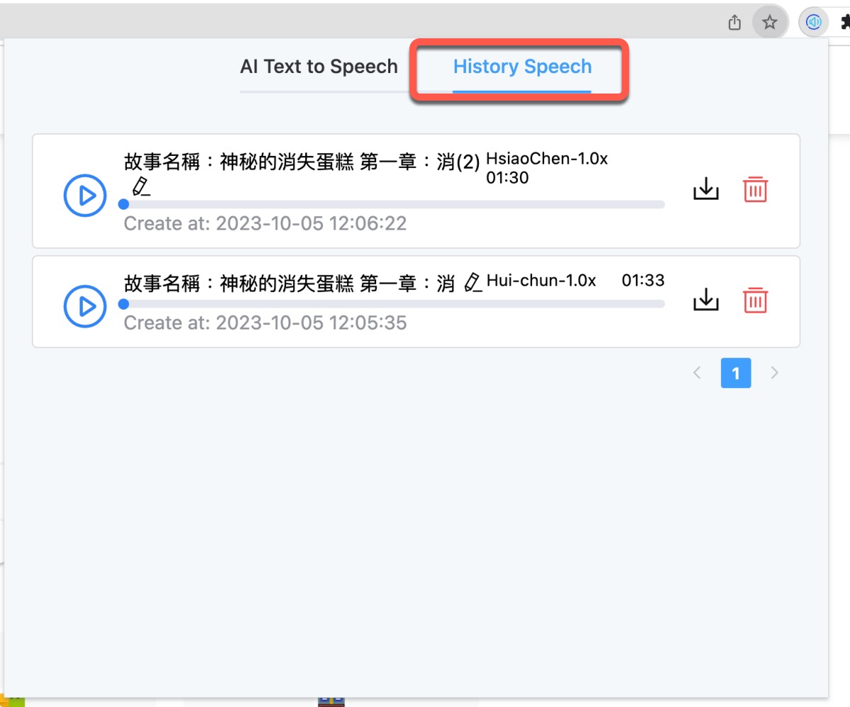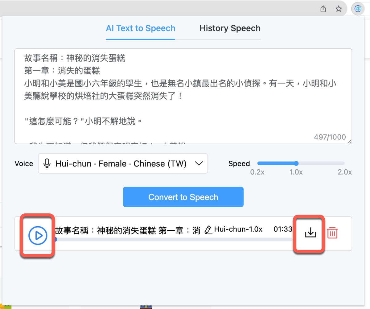 接下來就可以直接播放,或者下載儲存,我試下來還算不錯,以 AI 文字轉語音的工具來說,這款免費真的蠻佛的,大家也去試試看吧。