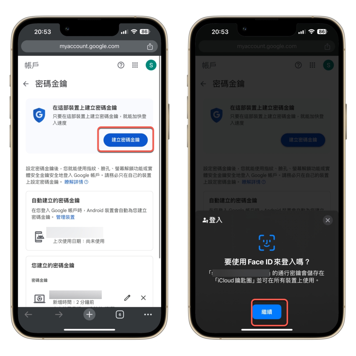想要設定密碼金鑰,看你想要在哪一個設備設定,直接用那個設備開啟上面的網址,然後登入 Google 帳號,基本上每個設備首次登入還是需要用到密碼,然後點擊「建立密碼金鑰」,如果是 Android 手機應該是以指紋辨識為主來做為登入使用,如果是 iPhone 則是 FaceID。