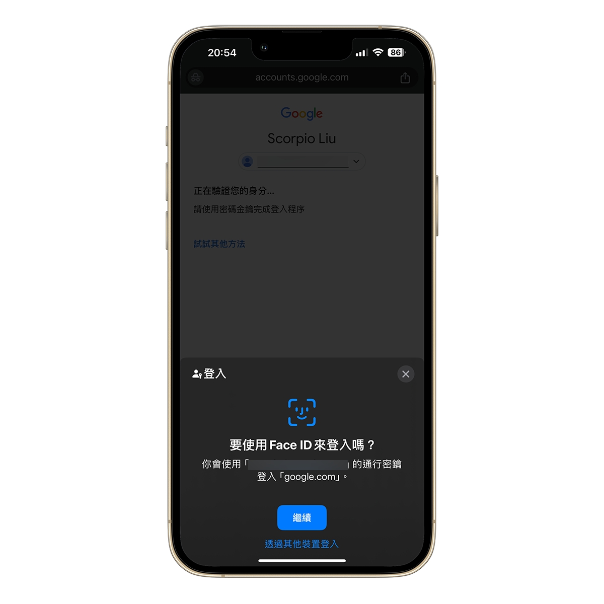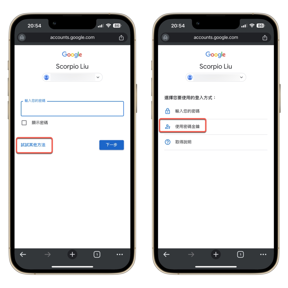 接下來有設定過密碼金鑰的裝置又要怎麼登入 Google 帳戶呢?很簡單,當你需要輸入密碼時,請點擊試試其它方法,然後選擇「使用密碼金鑰」。