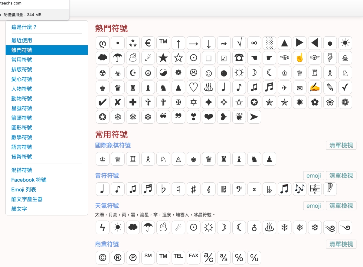 網站:https://tw.piliapp.com/symbol/進入網站後,左側有各種分類,右邊則是符號全列表,直接點擊想要使用的符號。
