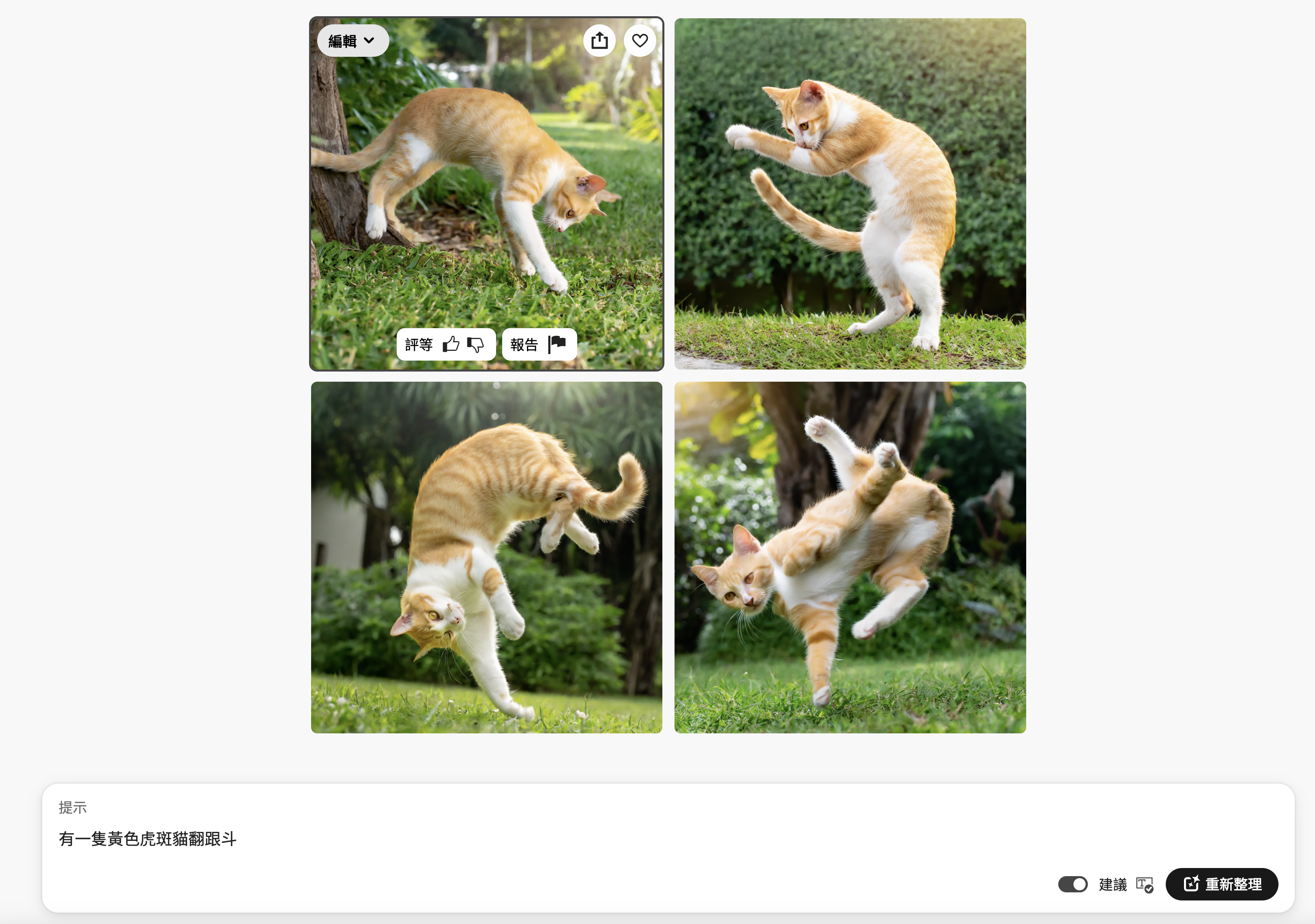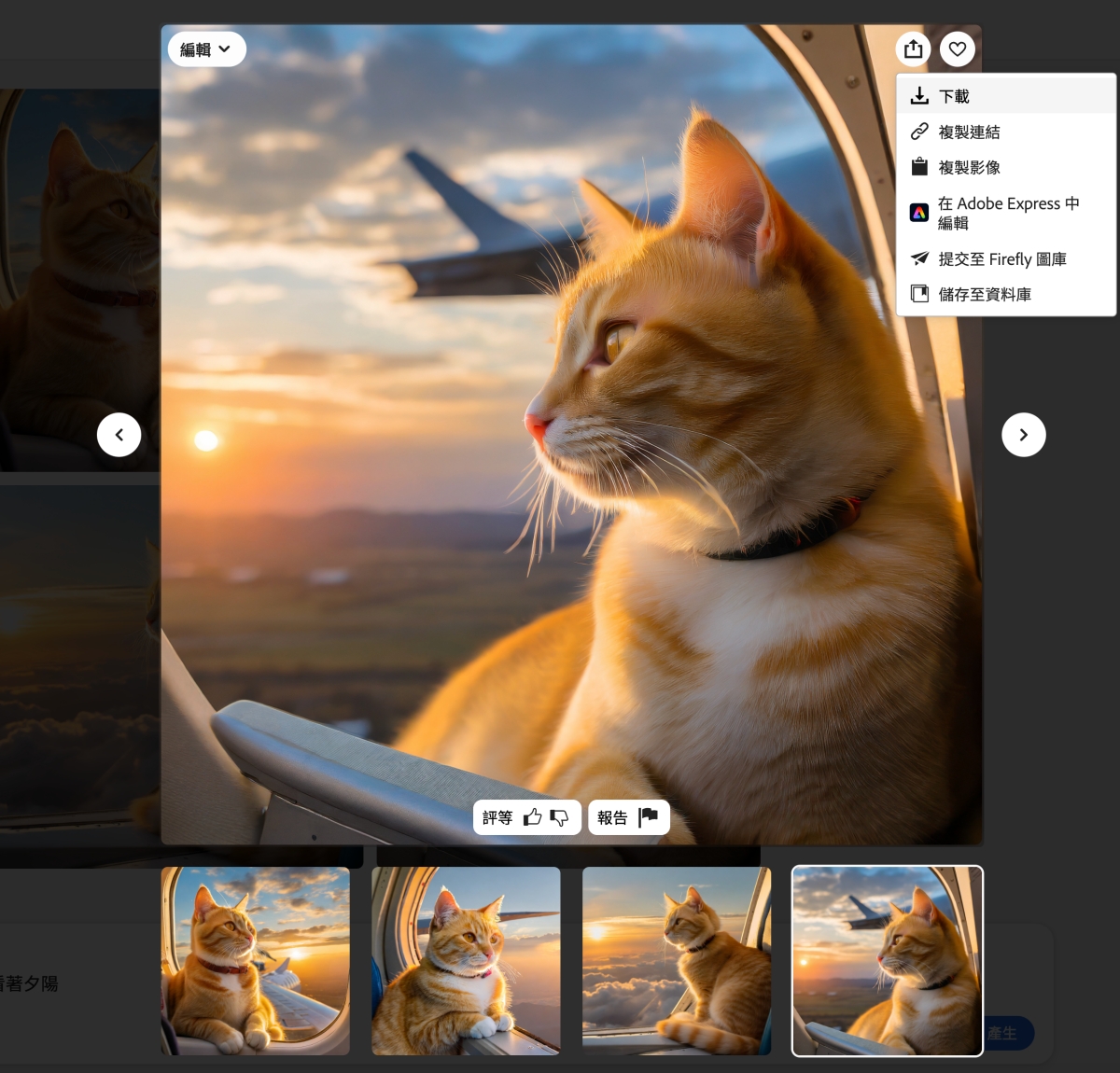 比如我想要有一隻黃色虎斑貓咪坐在飛機上看夕陽,我每次在其它 AI 繪圖工具打這句,很多都是給漫畫出來,或者哪裡怪怪的,我們來看看 Adobe 的如何。