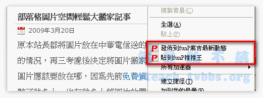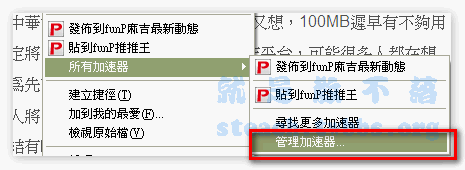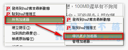 這就是站長先前介紹到的,右鍵加速器的功能,其中包括了Funp這大家常用到的東東。還有很多其它右鍵可得的服務哦!