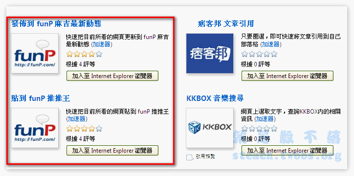 會跳到所有最新加速器的頁面,目前Funp按鍵在第2頁找的到,其中還有各式各樣的加速器任君挑選,像是痞客邦的也有,幾乎常用的都收錄進來了,選擇要用的加速器,點擊加入Internet Explorer瀏覽器
