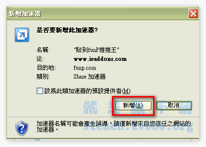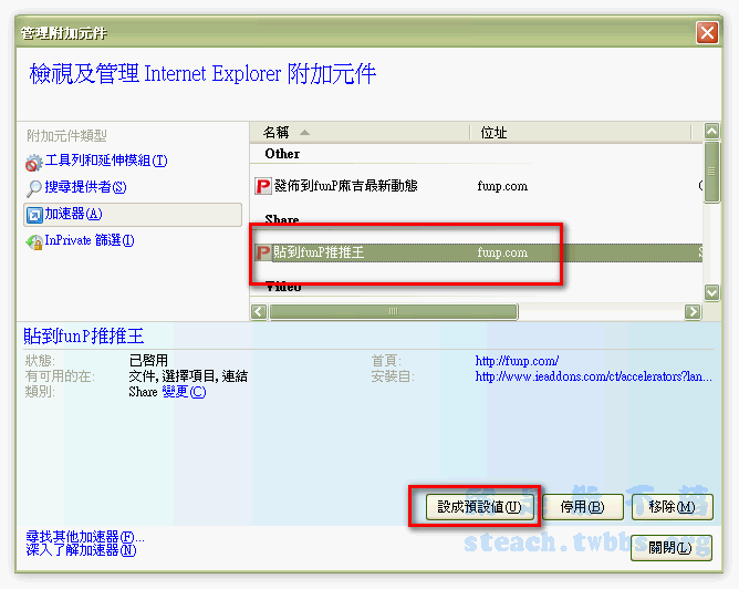 找到剛剛新增的加速器,將他設成預設值,就會出現在右鍵囉,如果不想使用的時候就把他停用或移除即可,是不是很方便呢?如此一來往後看到好文章立即右鍵馬上推去Funp啦,超級方便啦!