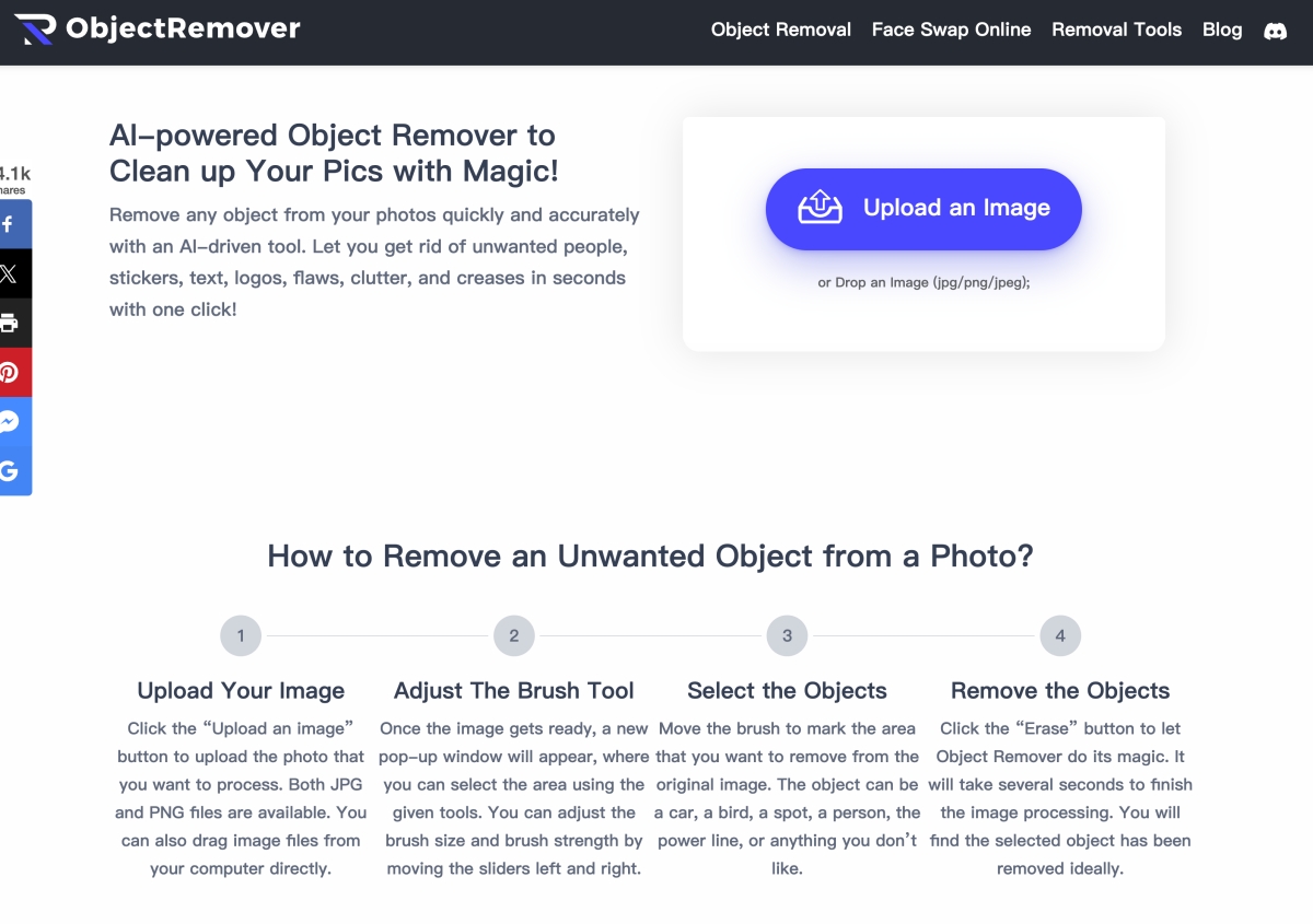 網站:https://objectremover.com/進入網站後,直接拖曳照片到右邊的 Upload an Image 即可。