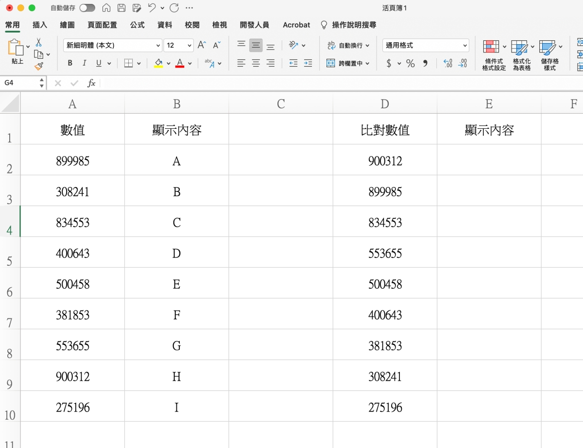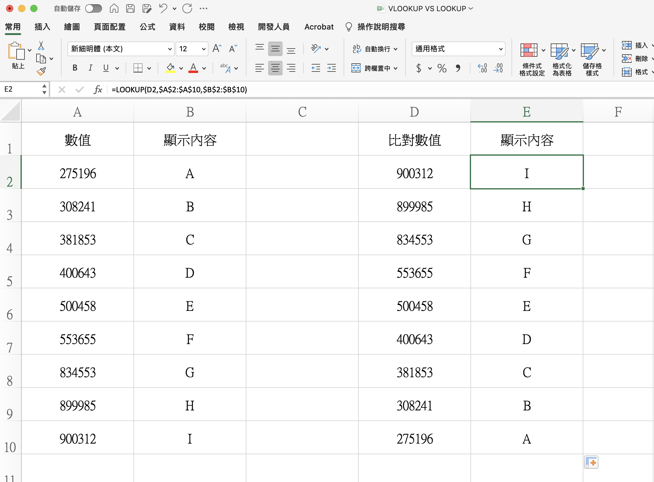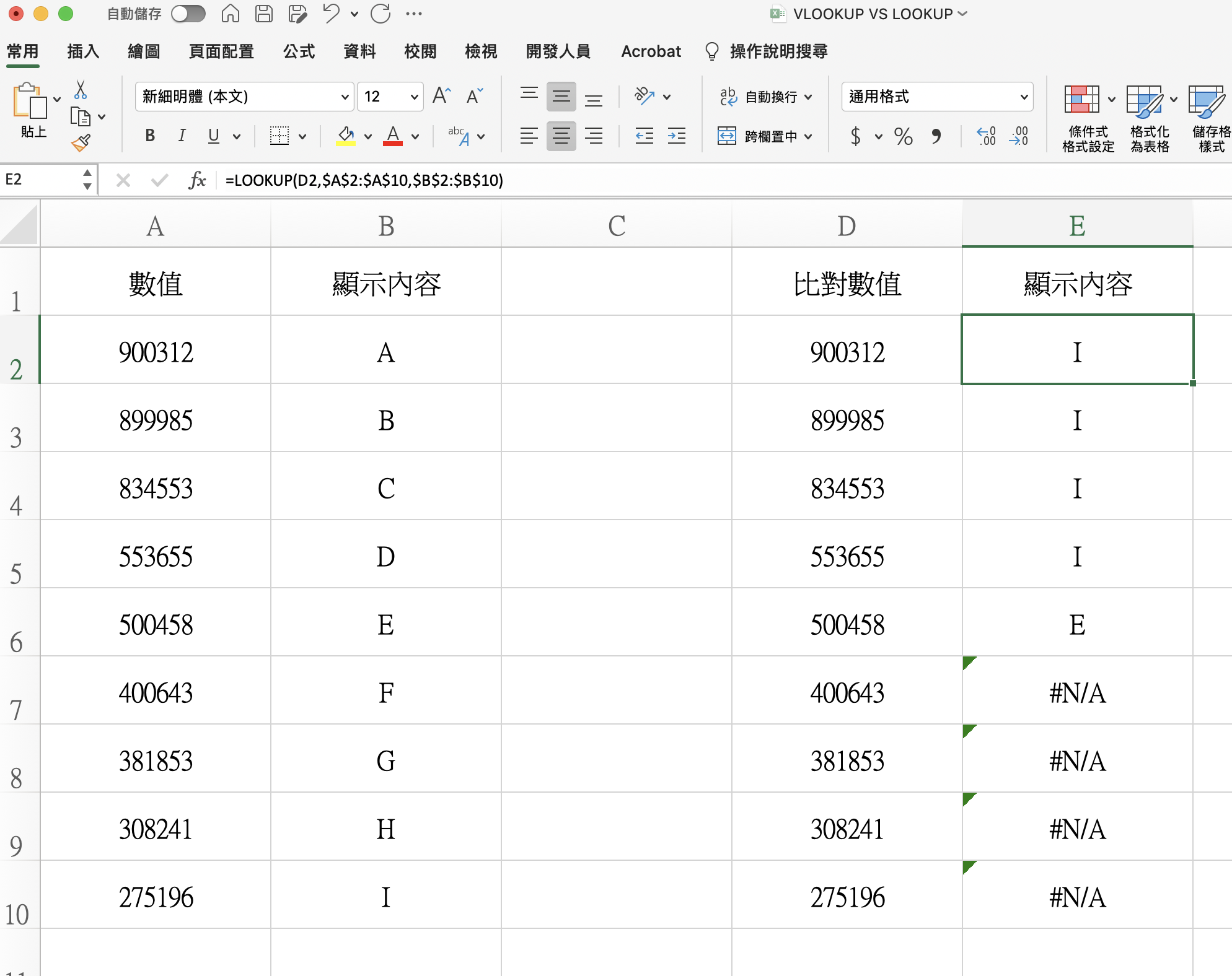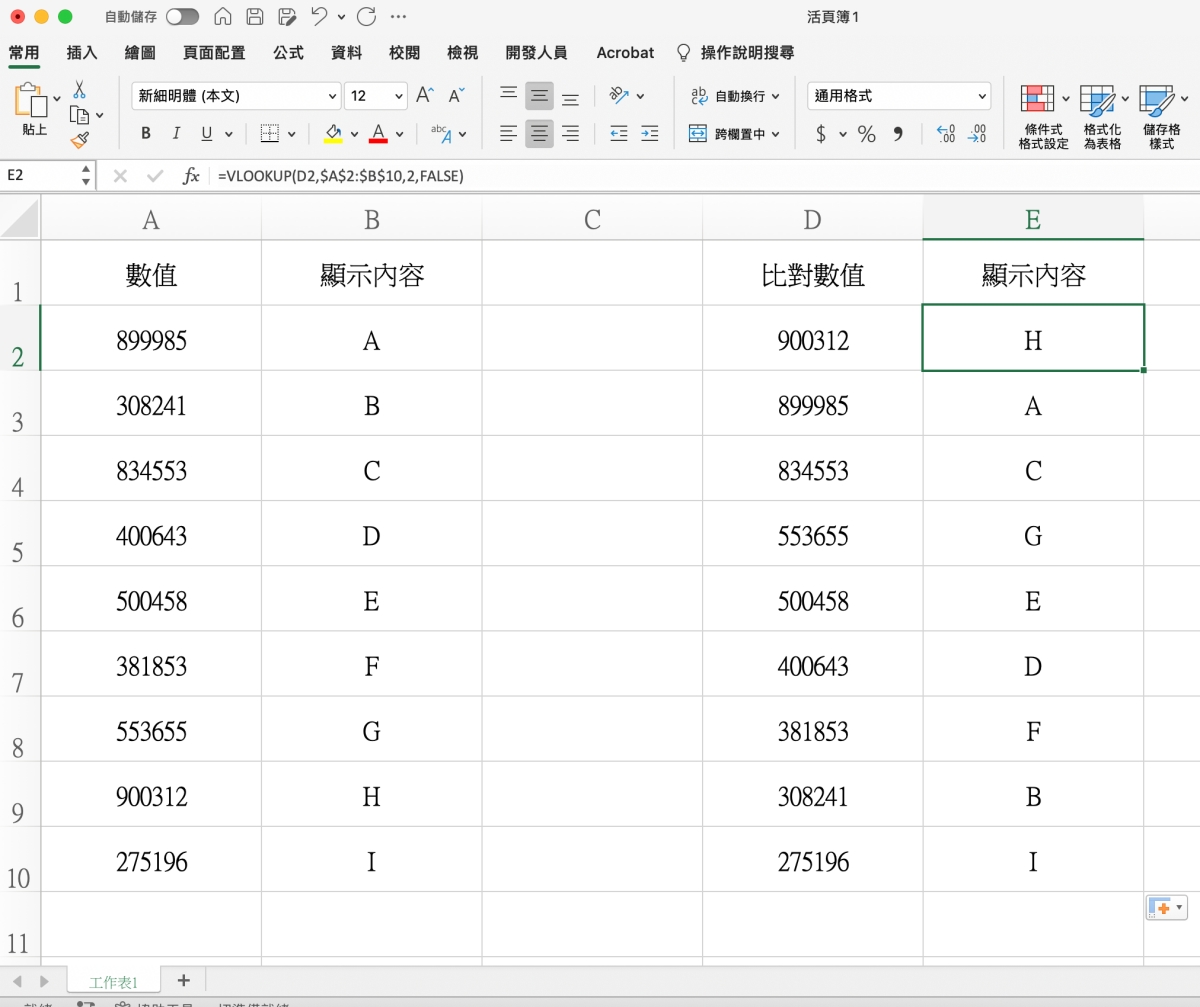 首先,這內容大概是這樣,在 A 欄有一排數值,B 欄是對應的內容,他要在 E 欄用 D 欄去比對 A 欄後,顯示 B 欄的內容,簡單的說,就是拿 D 去比對 A,如果符合就把隔壁的 B 顯示。