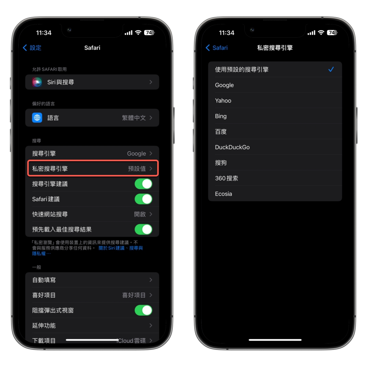 讓私密(無痕)頁面的搜尋引擎變第二個預設,在新的 iOS 17 裡,私密頁面可以分開設定,自行選擇私密頁面的搜尋引擎預設用誰。