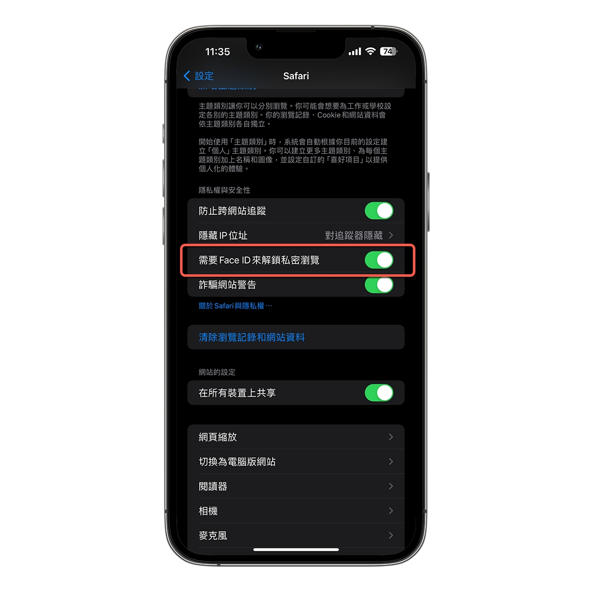 而且還可以設定使用 FaceID 解鎖私密瀏覽頁面,讓你的密瀏覽畫面真正的私密。