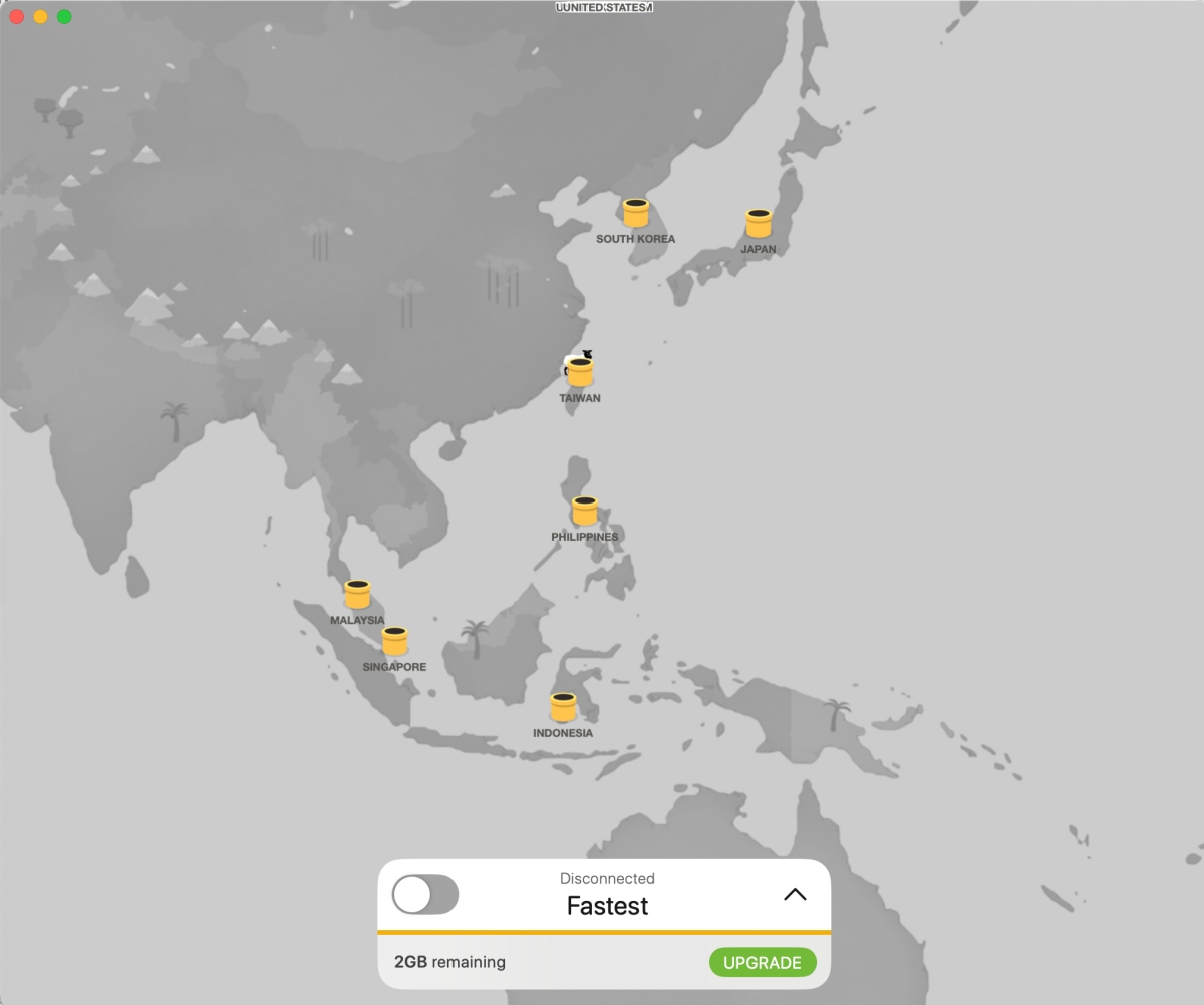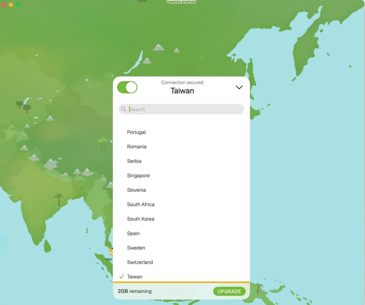 介面很簡單,就一個開關,跟上拉選擇伺服器,而左下角會顯示當月的 2GB 流量還剩下多少。