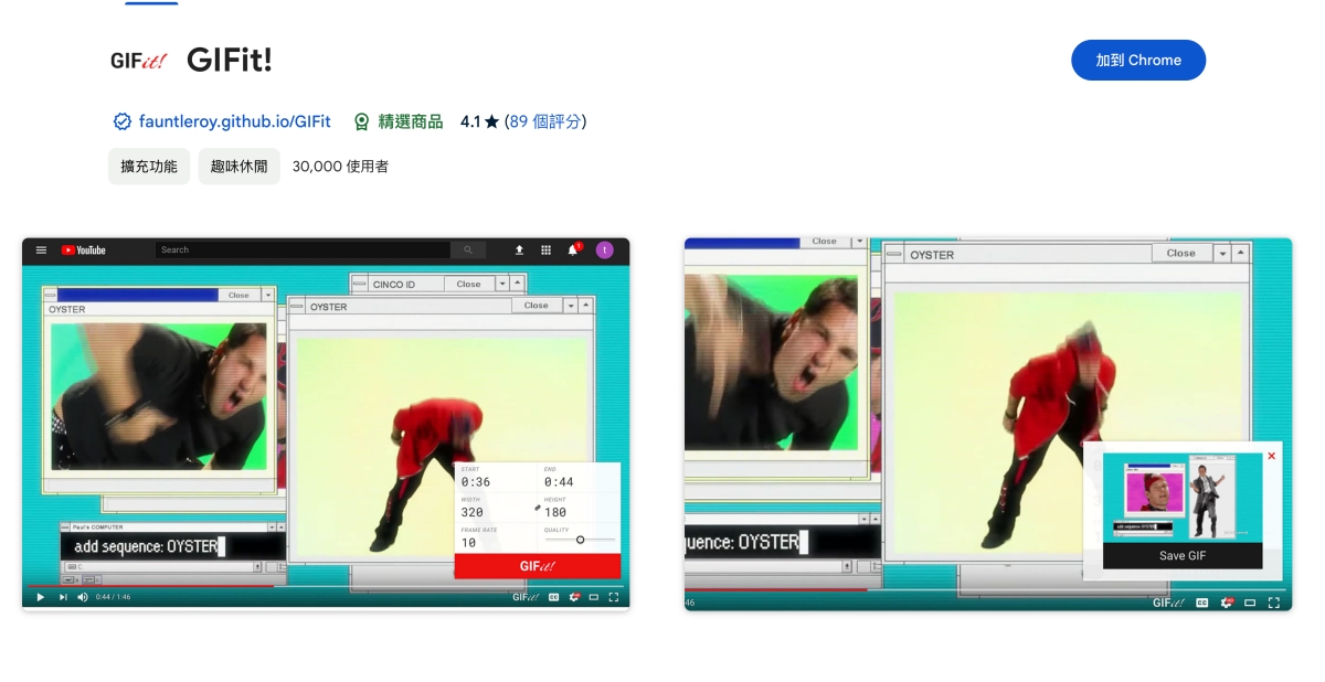GIF 動態圖檔,以為在影片廣泛後會漸漸被取代,結果沒有,反而因為影片廣泛,GIF 格式就變成是大家擷取影片內容後轉換的內容,畢竟檔案比較小,特別是拿來做表情包最方便,不過很多人對於要製作 GIF 檔案還是不太會操作,今天來分分享一個 Chrome 的外掛 GIFit,只要安裝後,你的 YouTube 介面就會直接多一個按鈕,按了就可以快速的製作出 GIF 檔案,超級方便。
