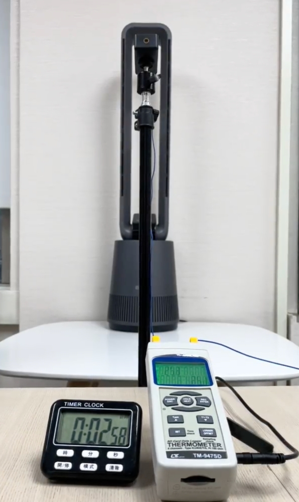 至於升溫的部份,到底升溫有多快,我們同樣的將測溫器放在出風口一定的距離位置,然後分別試看看 1 分鐘及 3 分鐘的溫度變化吧。