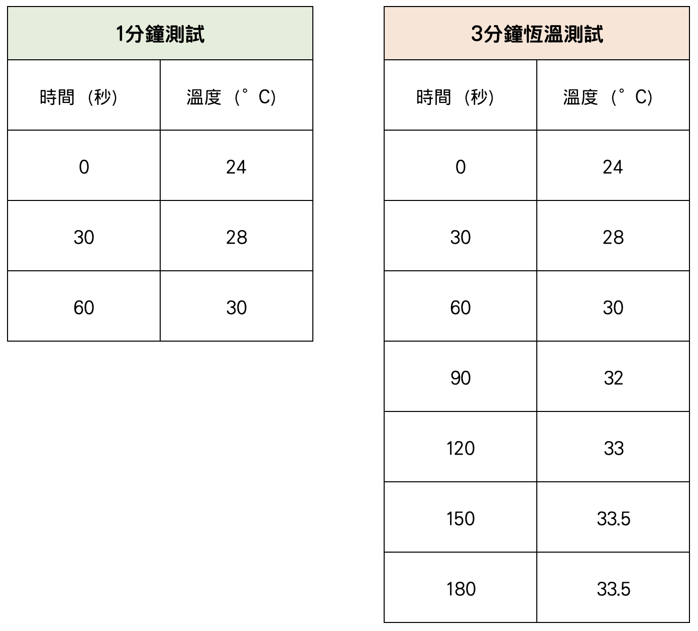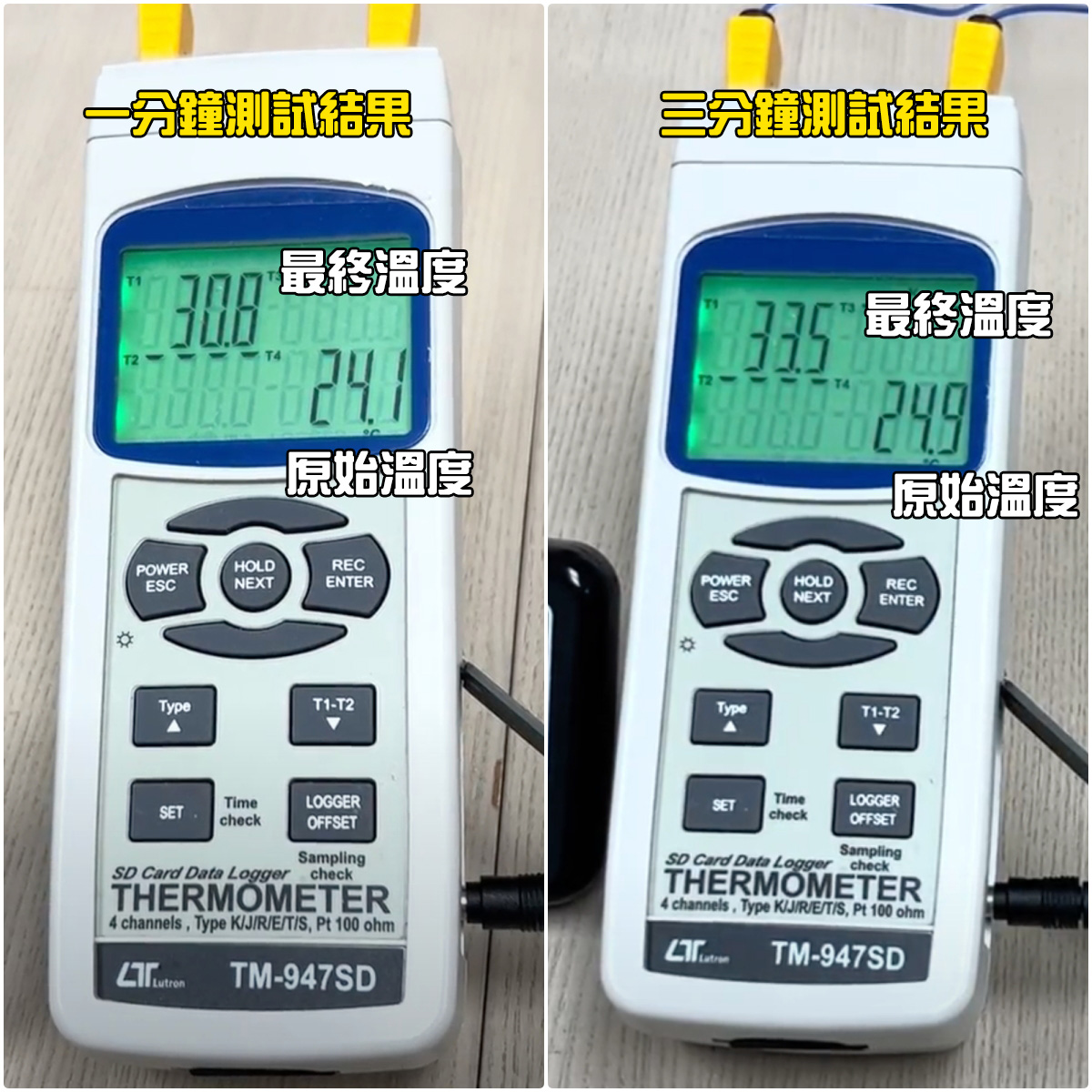 首先看看左邊的一分鐘測試,原始溫度是 24 度,在經過 1 分鐘後從 24 度升到 30 度,足足提升了 6 度,升溫速度真的超快。