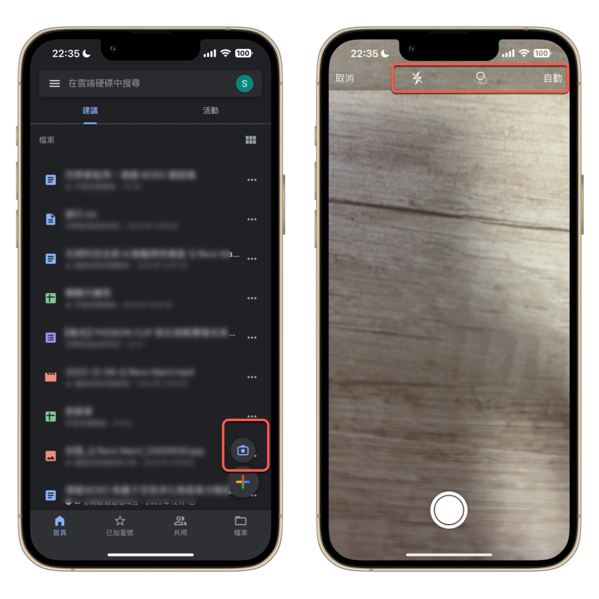 首先請打開你的 Google 雲端硬碟 App,看一下頁面上的右下角是不是多了一個「相機圖示」,如果沒有請確認你的 App 最新的版本。