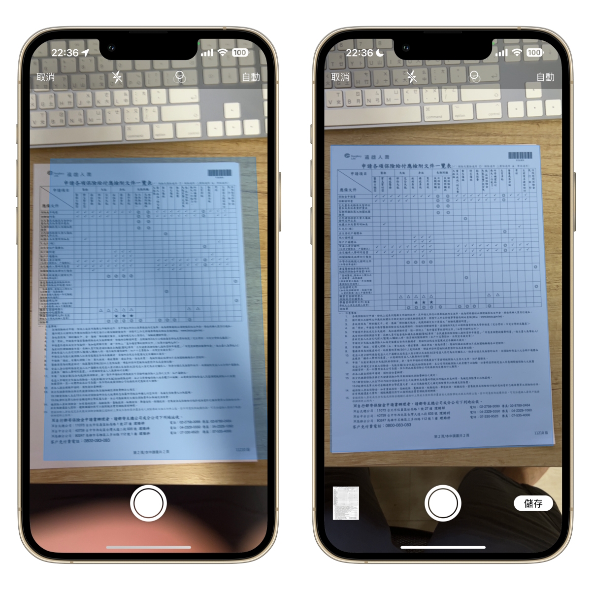 當你選用自動快門時,你相機慢慢對上文件,只要偵測到邊框都對到了,就會自動幫你拍照儲存,這功能非常方便,如果你有大量的照片或文件想要翻拍的話,架個腳架後,一直換內容就可以了,不用自己按快門,而且可以連續的一直掃描下去,最後再一次性儲存就好。