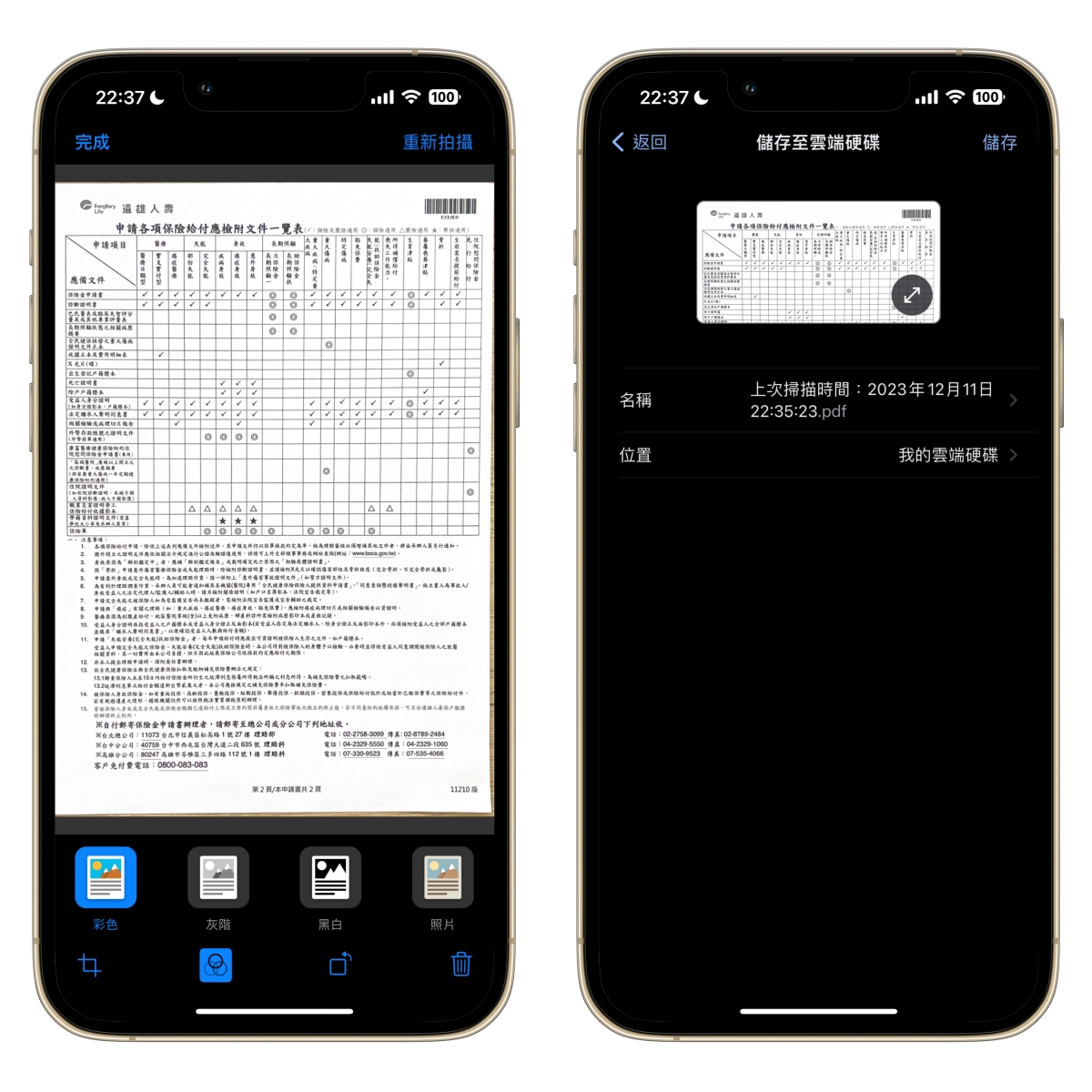 每張掃描下來的內容都可以簡單的後製裁切跟濾鏡、最後只要按下儲存就可以一次性的將全部的文件都上傳到 Google 雲端硬碟去使用囉,是不是超方便。