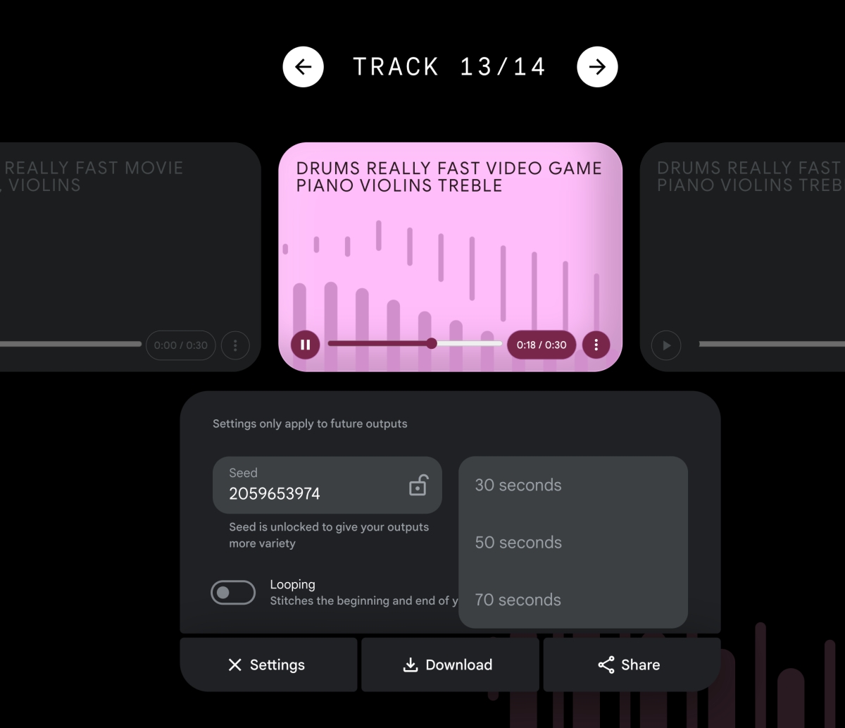 產出後除了試聽外,也能下載來使用,而且可以選擇 30~70 秒的長度,我大概試了一下,跟一般 AI 一樣,描述的愈清楚,愈能產出貼近需求的內容,目前雖然剛推出不久,但其實已經蠻厲害的了。