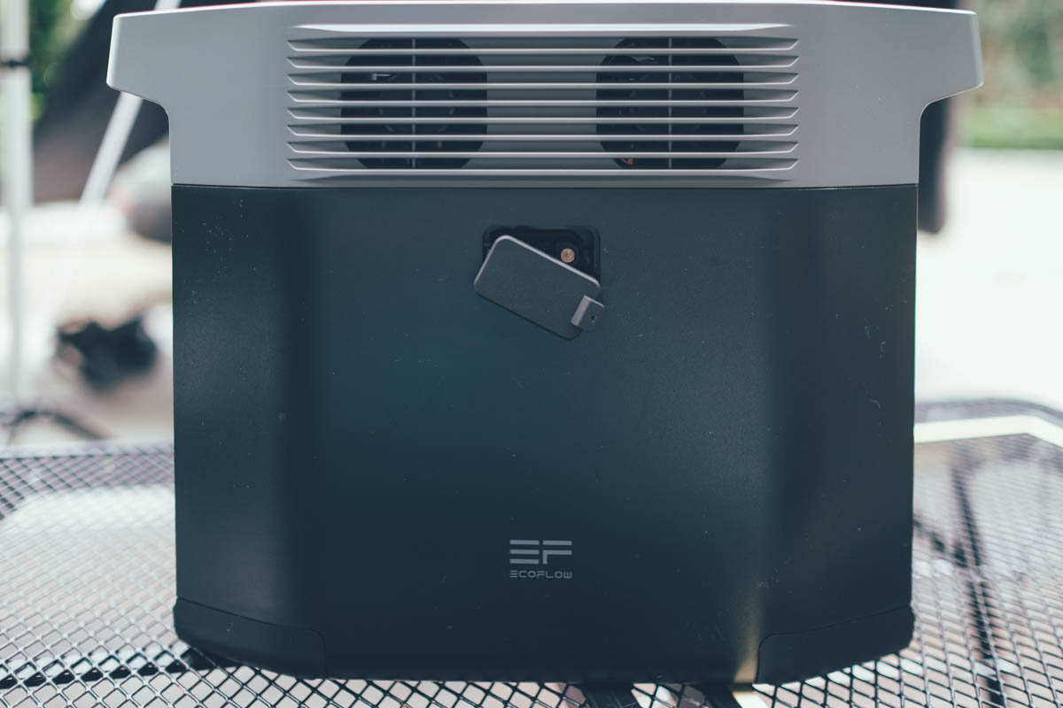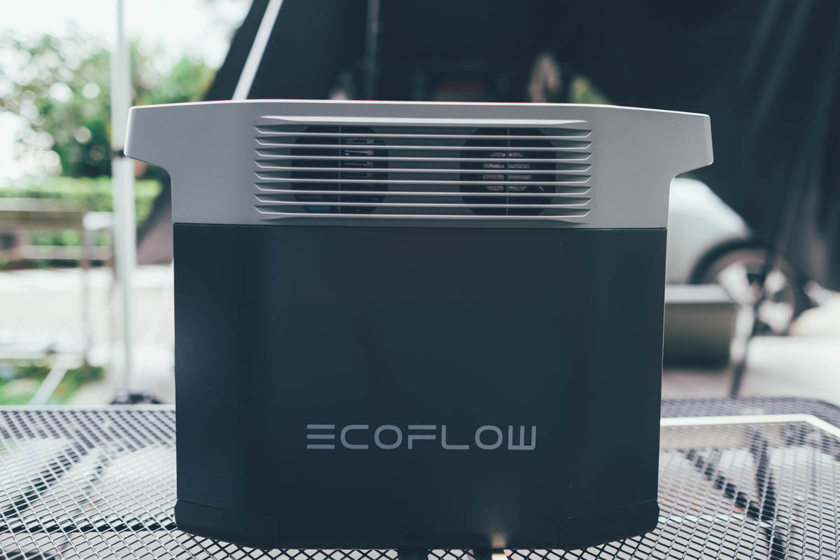 另一側小 Logo 這邊同樣有二個散熱孔,幾及一組擴充接頭,而這個擴充接頭是用來幹嘛呢,可以直接再外接擴充一組 1024 Wh 的 DELTA 2 額外電池,或是再加一組 2048Wh 的 DELTA Max 額外電池,也就最大可以擴充到 3KWh 的電量,以露營來說,一天一度電就蠻夠用,三度電大概可以三天二夜或四天三夜,當然還是要看怎麼使用啦,如果你是要接電暖器 200~400W 或是像攜帶式冷氣 400~600W 左右的話,那三度電應該一天就會耗光光。