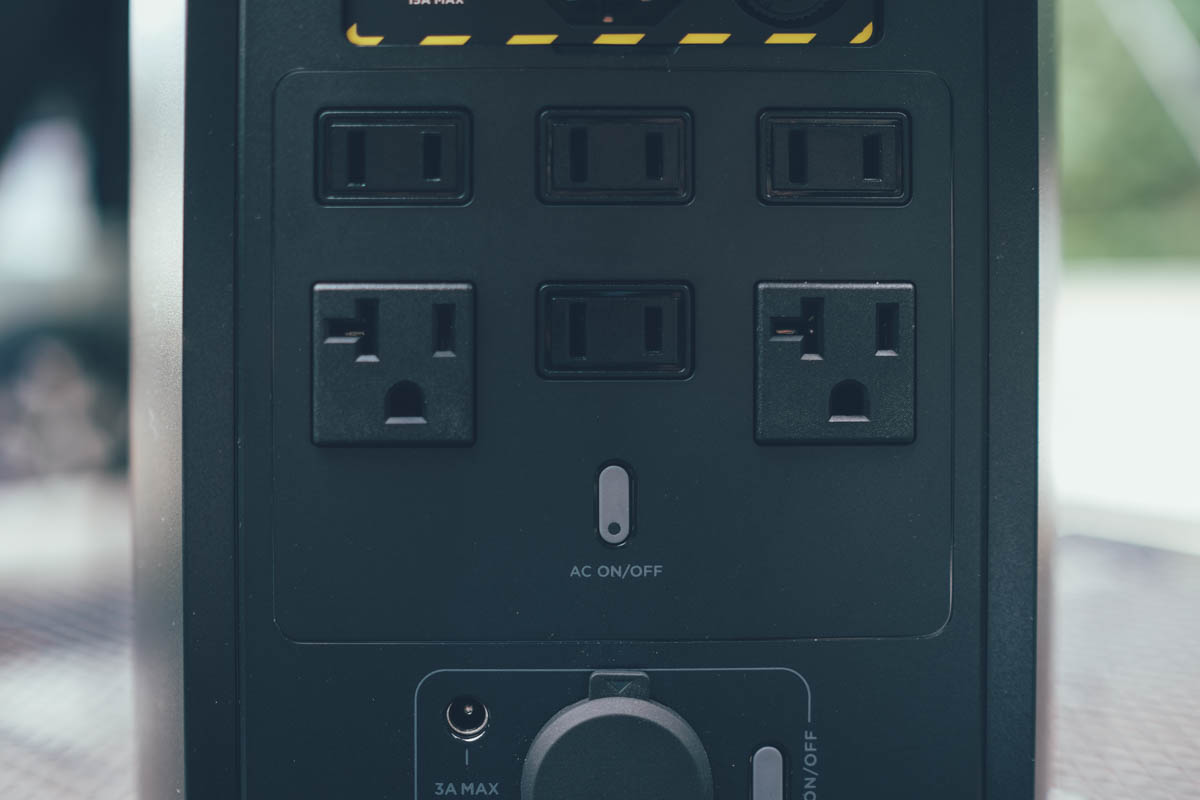 第二個區域是 AC 輸出,一共有四個雙插幾及二個三插,總功率支援 1800W,如果超過 1800W 會自動啟動保護機制斷電。