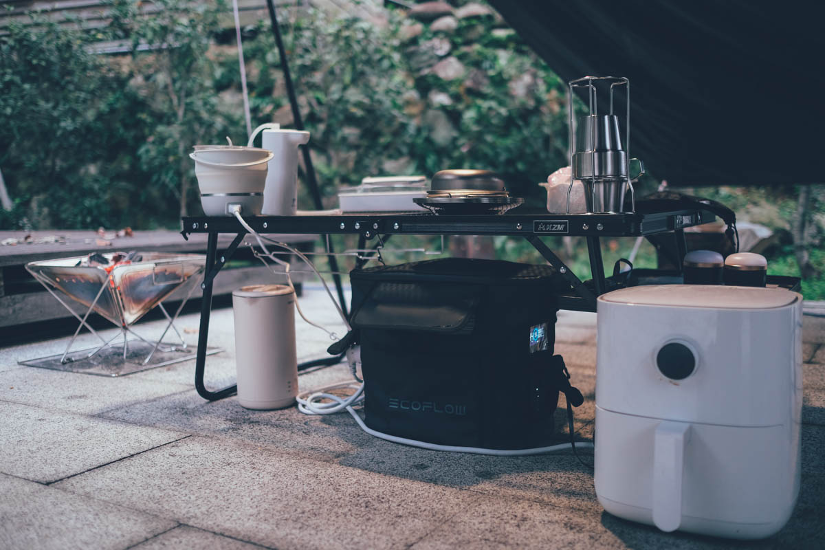 露營對我們來說,與其說長遠計劃,我們倒比較常是說走就走,有時看了一下週末沒什麼行程,臨時找了個營地或是可以車宿的地點就輕裝出發,像我們這次就單飛去新竹的露營區,一切從簡,除了焚火台取暖外,打算直接不開火,全靠電來煮食跟熱水,當然營區的電是撐不了高功率電器的,所以我們自己帶了一組 EcoFlow DELTA 2 可攜式行動電源,滿電剛好好夠我們使用 2 天 1 夜,重點是最大支援 1800W 的輸出,就算是氣炸鍋都能直接用,讓我們這次的出行真輕快。