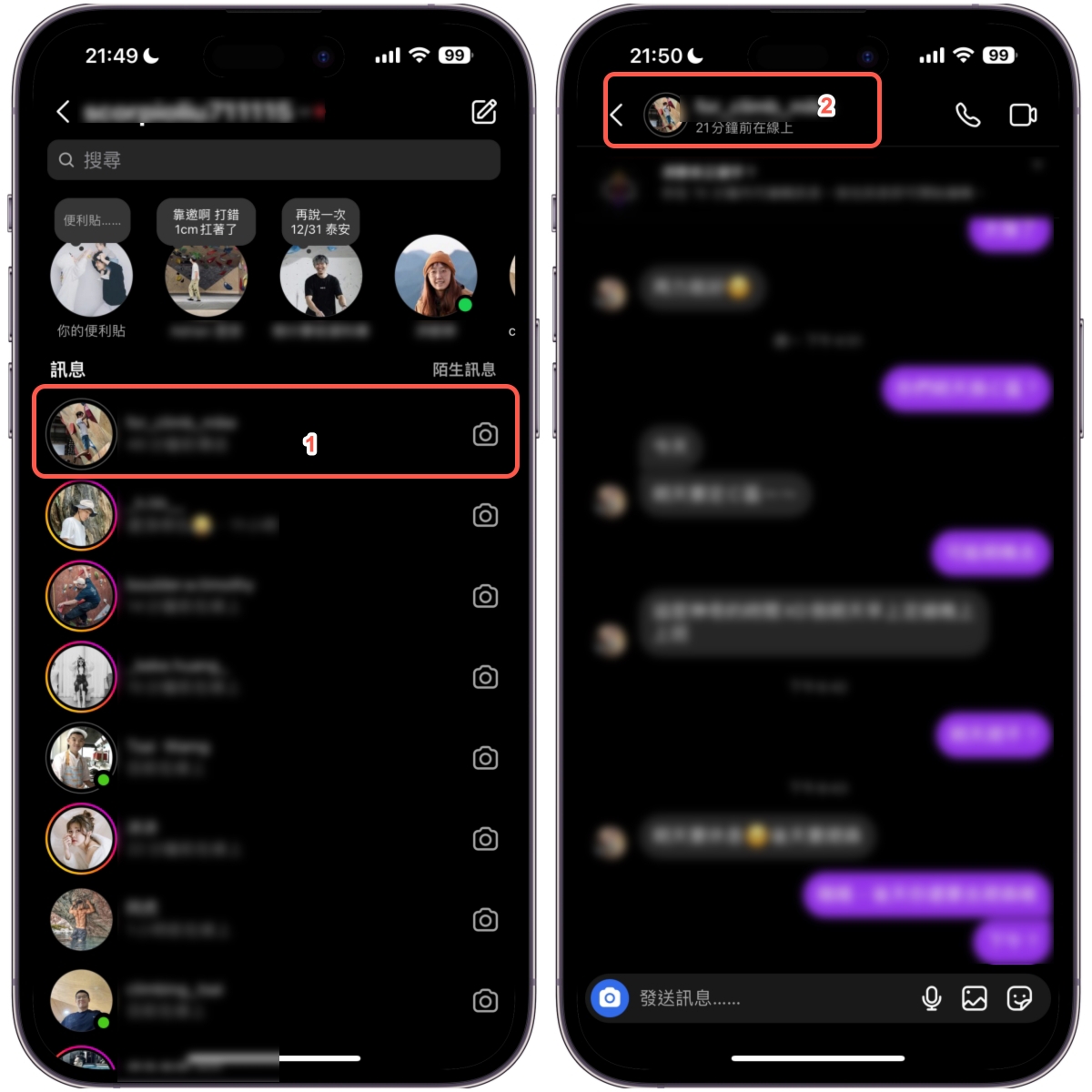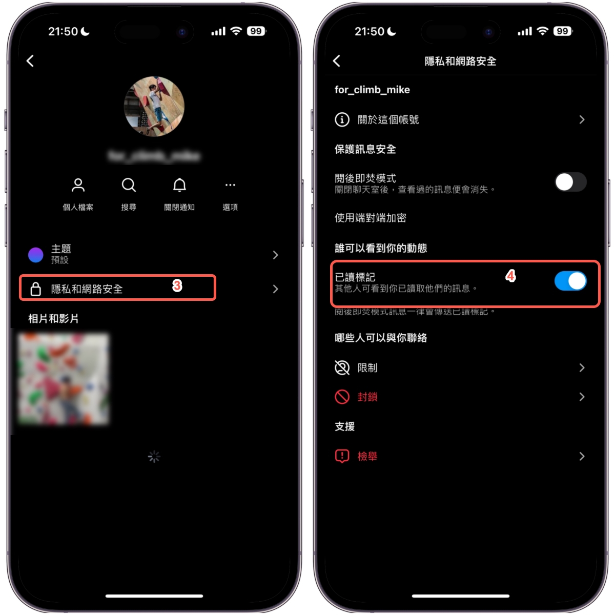 首頁 › 電腦小教室 › Instagram 必學技能 - 看過「某人」的訊息後,不會讓對方知道你已讀 Instagram 必學技能 - 看過「某人」的訊息後,不會讓對方知道你已讀 發佈日期:2023/12/27 作者:阿湯 分類:電腦小教室 現在網路的時代,大家在傳訊息時,應該已經很習慣的在看對方有沒有讀取,如果讀取了但沒有回應,你一定很想要再回覆個什麼,或者覺得對方為什麼不回,不過也真的蠻多怪人的,所以導致我們看完不想回覆,如果你身邊也有這種焦慮型朋友,你不想讓他看到你的 IG 已讀的話,那往下來學一下這招,只要針對指定對象設定一下,未來他傳給你的訊息,你放心讀完也沒差,因為對方不會再看到你已讀了。 Instagram 必學技能 - 指定對象不已讀 一共只要四個步驟,首先,找到你想要設定的對象,點擊他的訊息進去,進入聊天室後,點擊最上方他的人名。 進入「隱私和網路安全」,就會看到一個功能叫做「已讀標記」,只要關閉它,對方就看不到你已讀了,快去試試吧。
