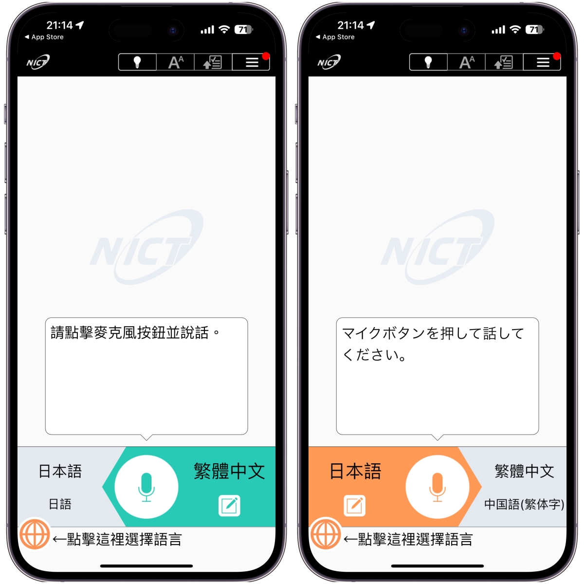 進入 App 後,使用時在下方可以左滑右滑來切換語言,左下角則是可以點擊選擇對方的語言。