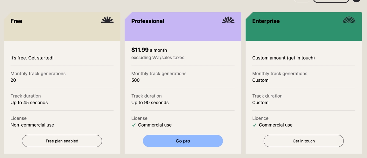 目前一共有三種方案可以使用,免費/專業跟企業,最大差異就是免費的僅限個人使用,不能用於商業用途,而專業跟企業就差在秒數跟可產生的的音樂數量。