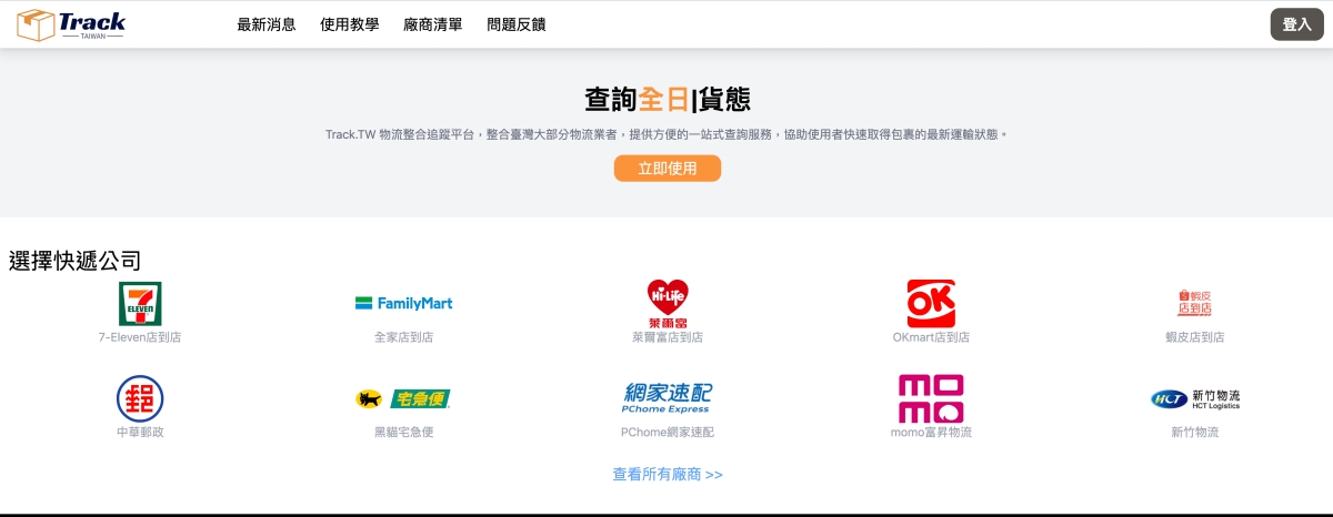 網站:https://track.tw/進入到網站後,如果你不需要 LINE 通知,也不用在帳號內統一查看,只想要單次查看的話,直接選擇你要查看的物流查詢即可,如果想要綁定 LINE 通知或者有多個單號要整合追蹤的話,就點擊右上角登入。