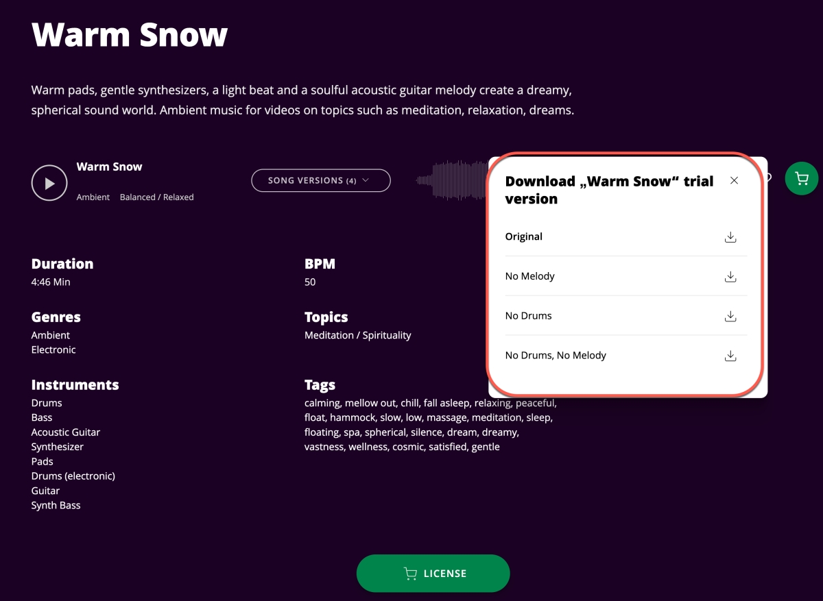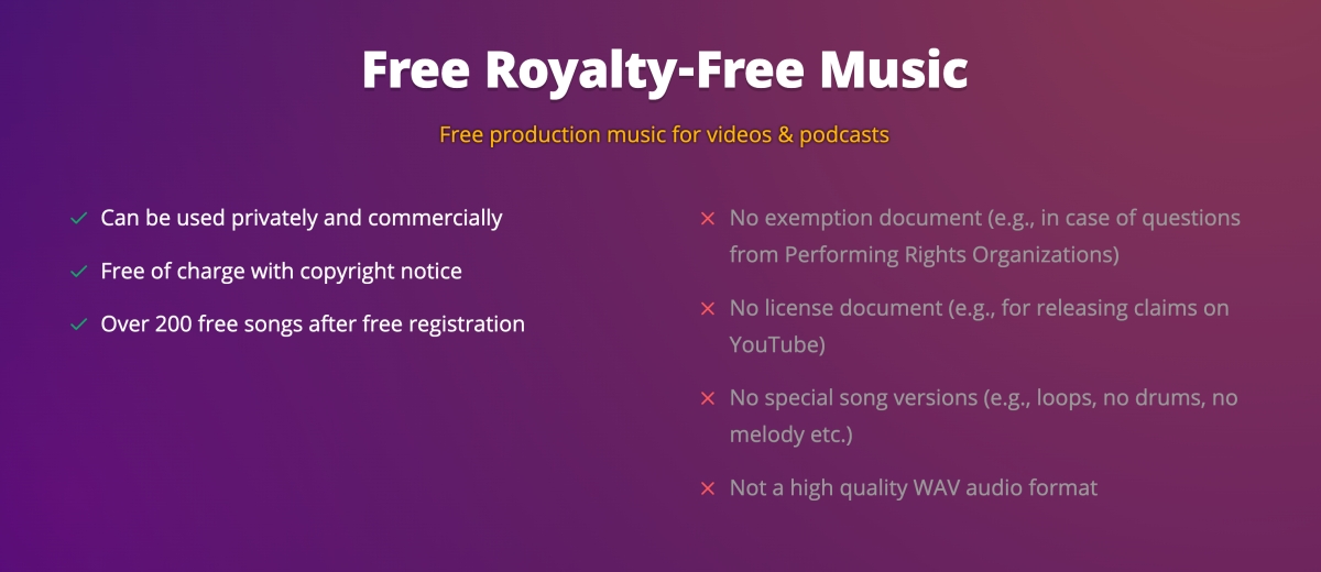 這邊就有明確的說明,可以用於個人或商用,大約有 200 首以上可以用,只是要有版權宣告說明,缺點是不是高音質檔案,就看你能接受的程度到哪了。