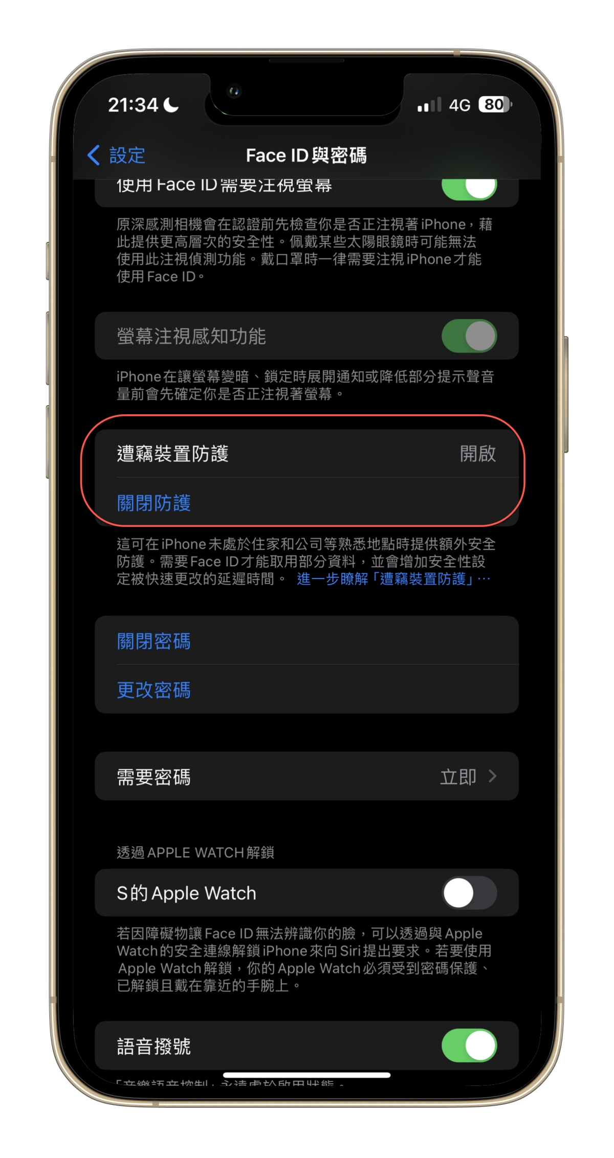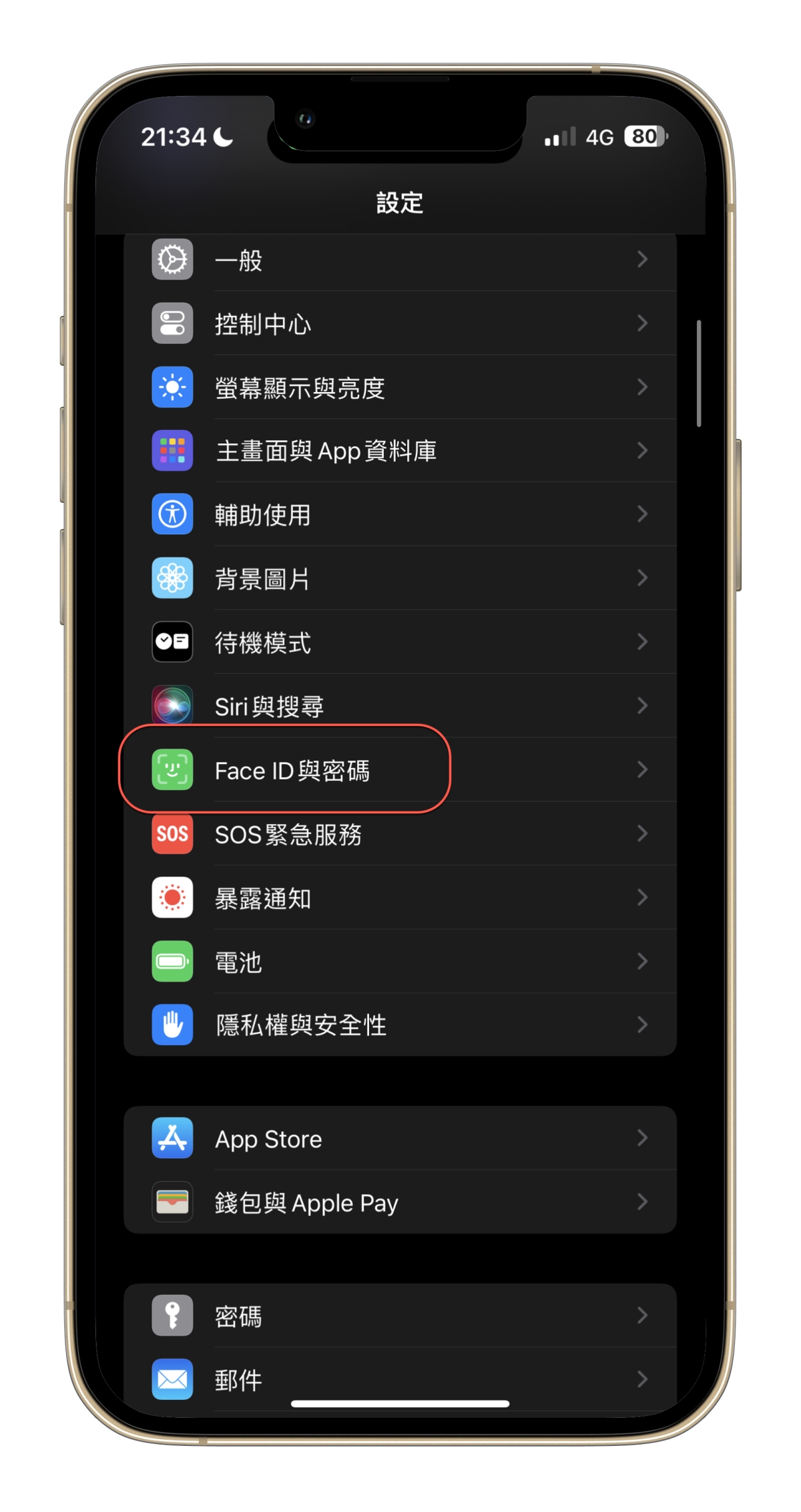 這項設定在 Face ID 與密碼裡。
