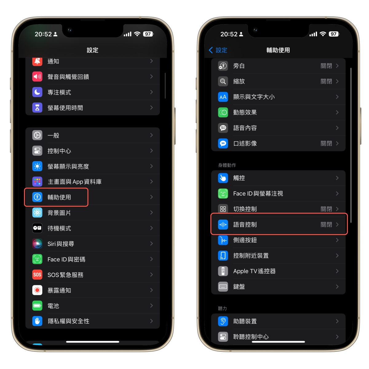 我們要利用的其實是 iPhone 內建的語音控制功能,平常這項功能預設是關閉,如果要使用,要先到「設定」>「輔助使用」>「語音控制」。