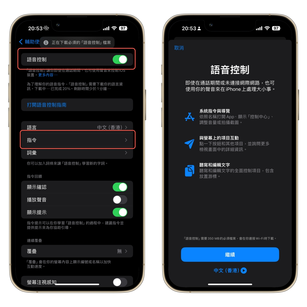 開啟語音控制設定後,點擊下方的「指令」,然後會有一些說明,都一直按就好了。