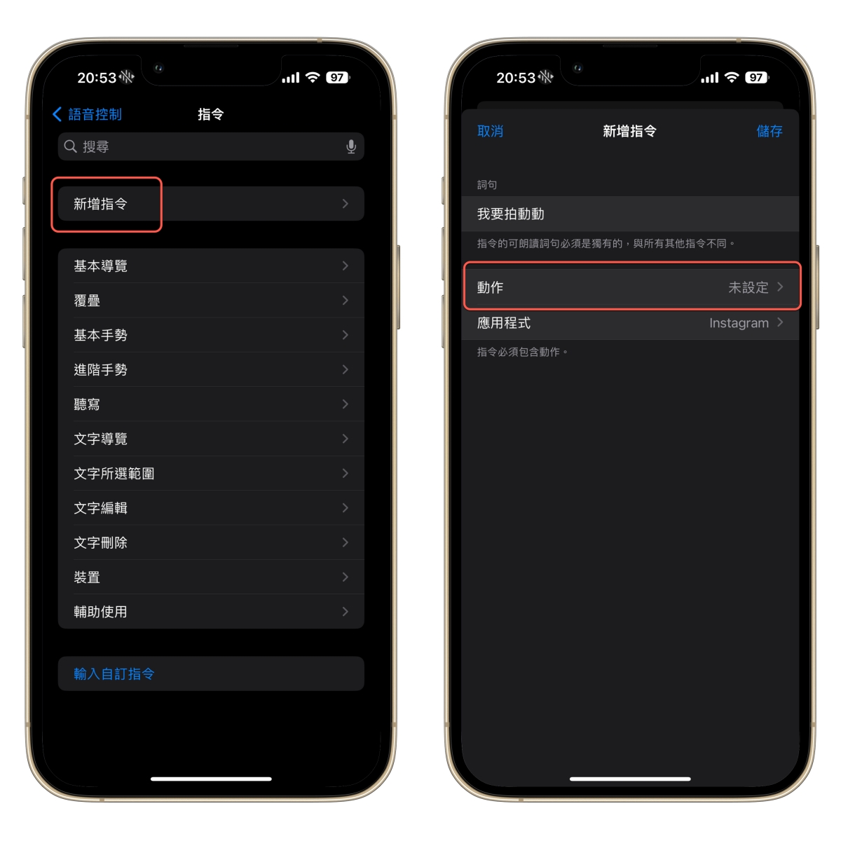點擊「新增指令」,接下來有三個部份要設定,詞句填入要你啟動的語音詞,你可以打「我要拍動動」,或是其它詞句都可以,第三個應用程式選擇 Instagram,接下來點擊動作。