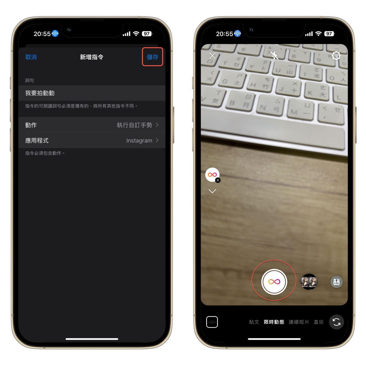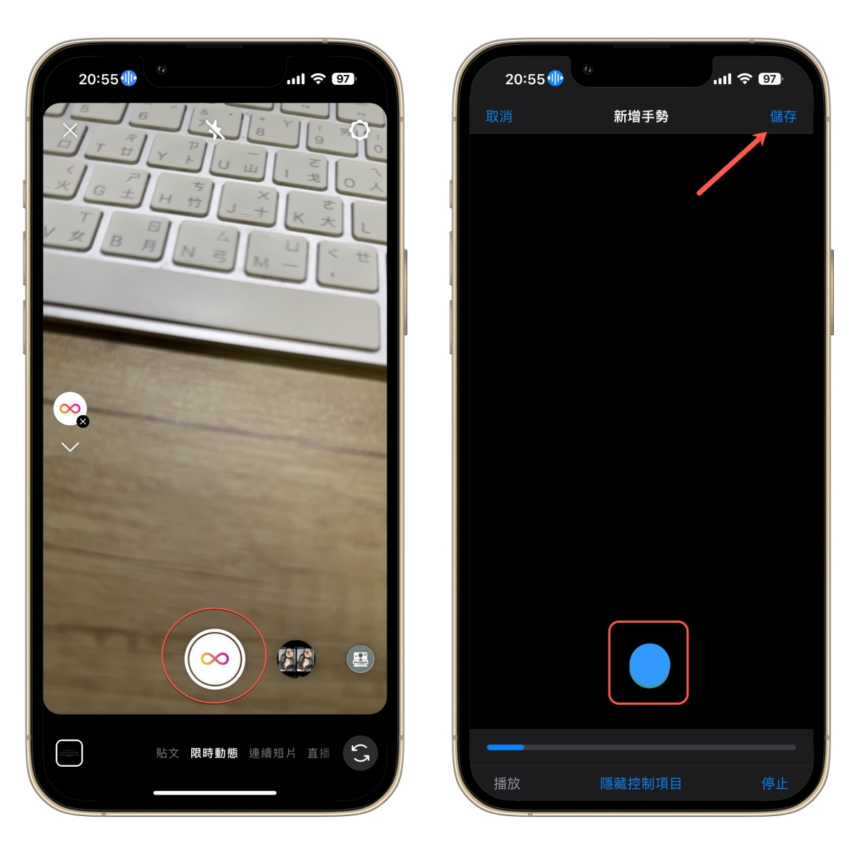 如果你忘了快門的位置,記得可以切回 IG 看一下,大概對一下位置,錄製完後,按下右上角的儲存。