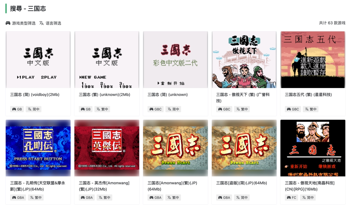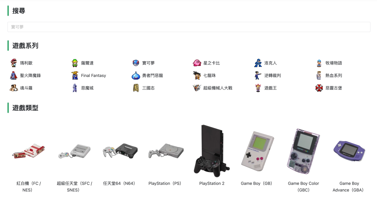 進入頁面後分成二種分類方式,第一個是一些比較熱門的遊戲系列,像是瑪俐歐、寶可夢、勇者鬥惡龍、三國志等,這些在以前的舊遊戲機中都是出了一代又一代,超多系列,像三國志就有幾十款。