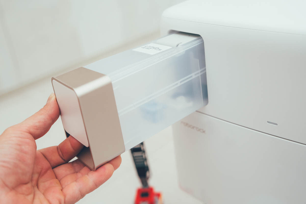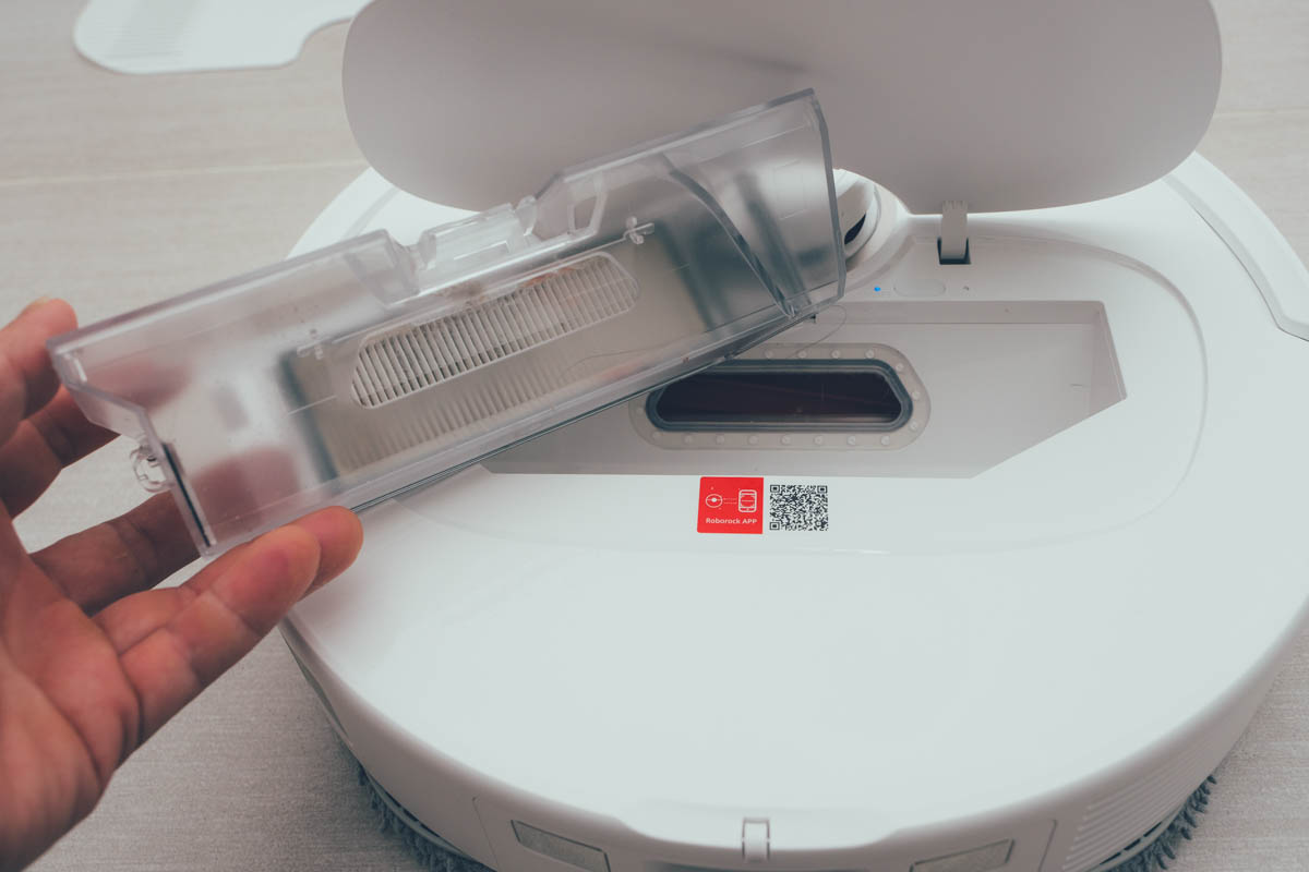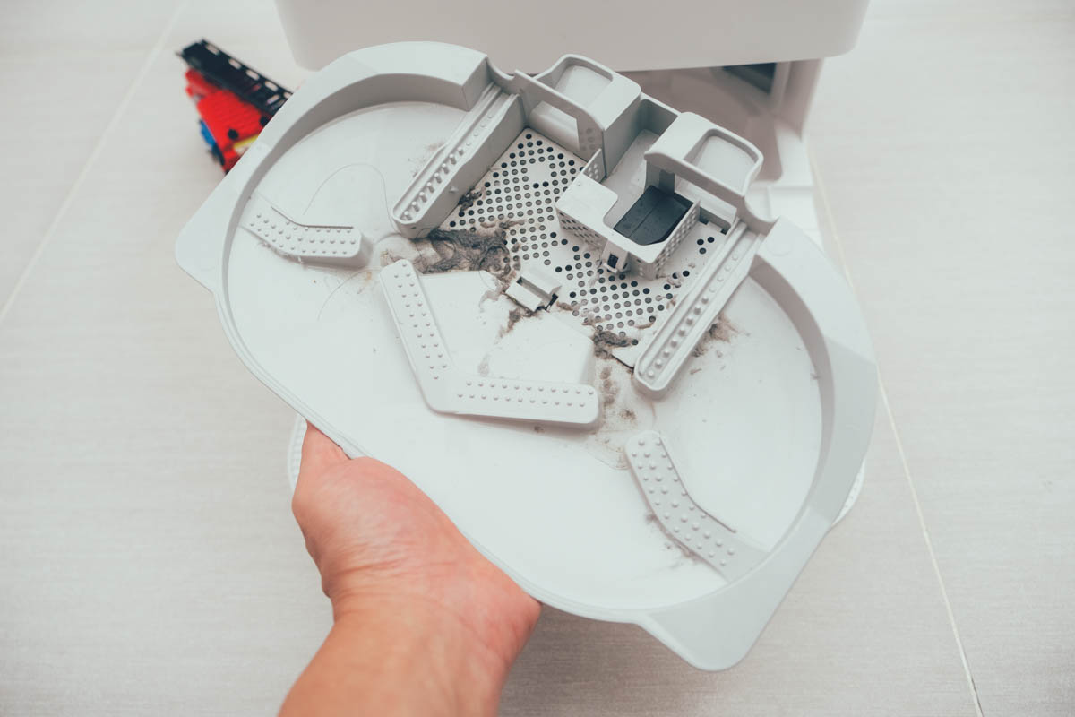 具有 HEPA 濾網的集塵盒,可避免二次空氣汙染,透過自動集塵我們可以來看一下,真的是蠻乾淨的,有些人都不太相信還會一直拿出來檢查,我自己除了要換濾網時會將集塵盒拿出來,不然真的是沒什麼機會看到它了,下一代搞不好只剩下換濾網的地方了。
