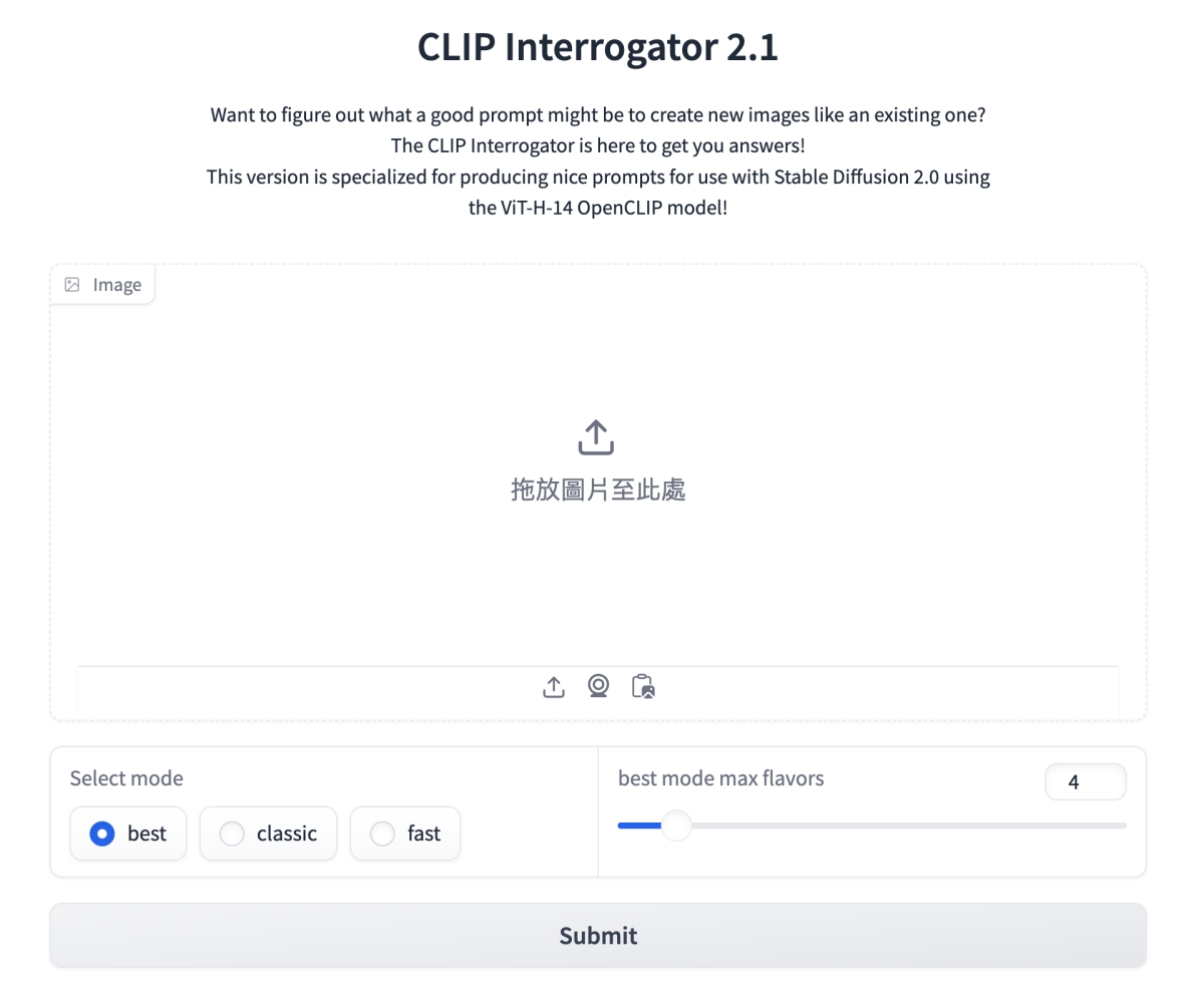 網站:https://huggingface.co/spaces/fffiloni/CLIP-Interrogator-2進入網站後,直接將圖片拖曳到中間的上傳區域。