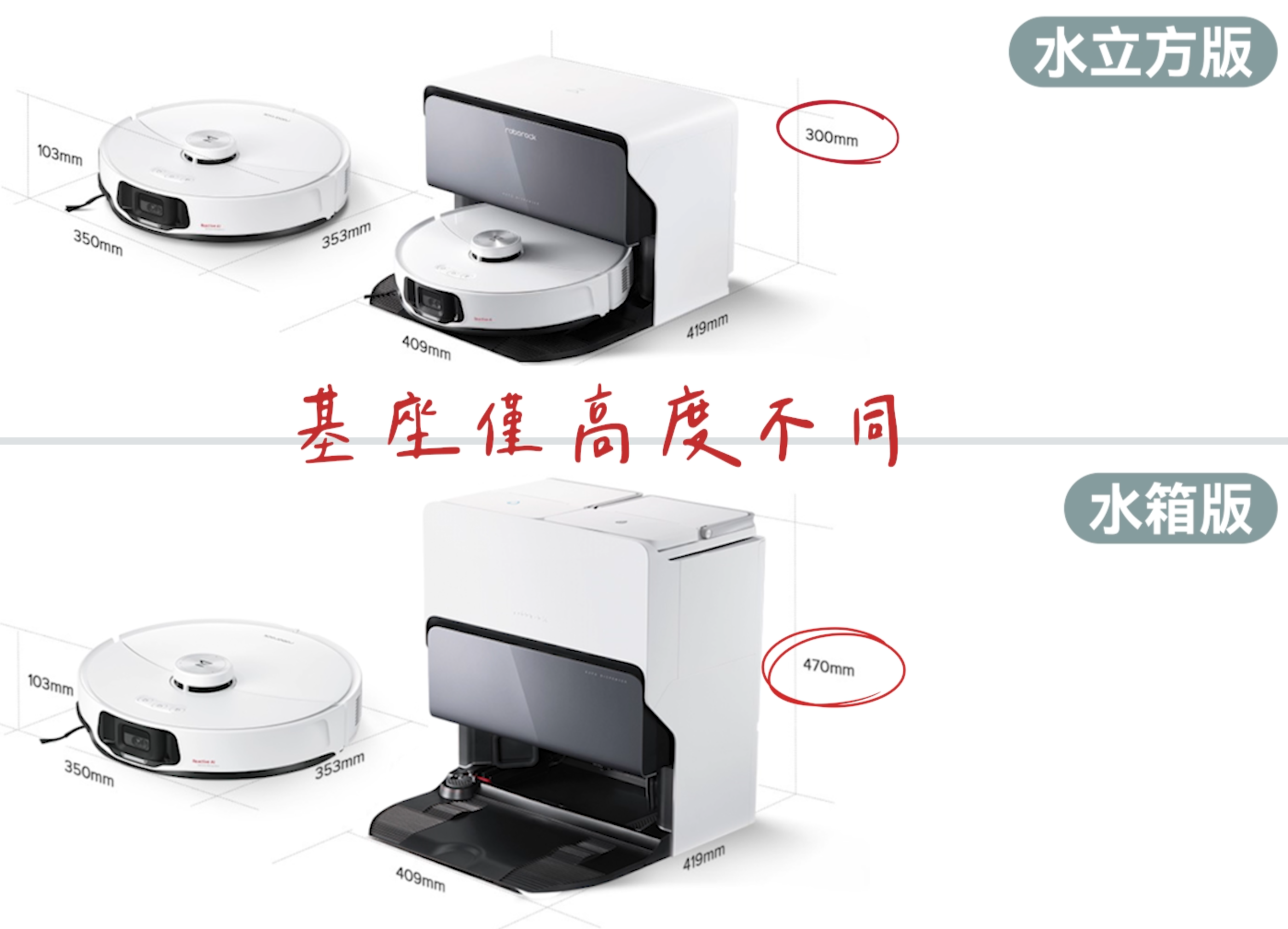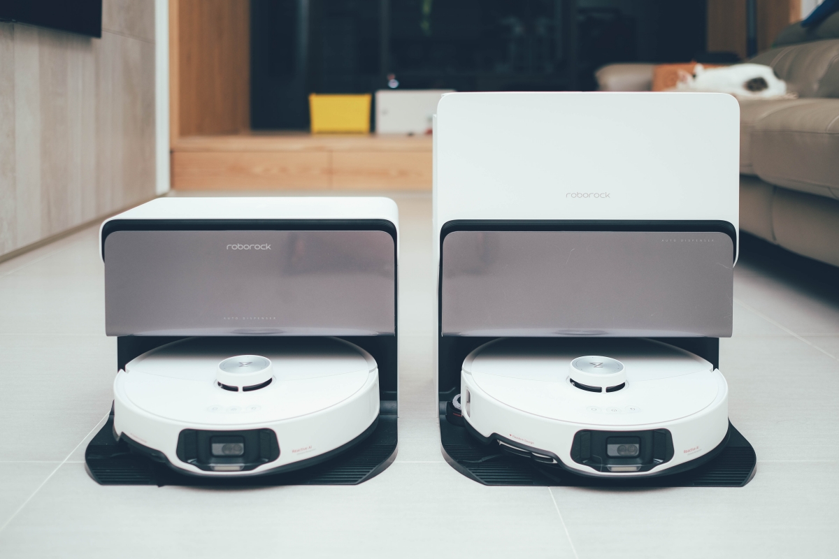 首先我們來看一下大家最關注的體積的部份,這次石頭科技推出 S8 MaxV Ultra 時,我就已經先去查了國外的官方網站,第一眼看到照片時就覺得太不可思議了,這體積也太小了吧,光是這高度就可以屌打一大堆掃地機器人,雖然現在蠻多品牌都有做自動上下水的功能,但是體積這麼小是唯一一台,做成這麼小一台最大的好處就是,更不佔用家裡的空間,很多人在一開始改用「有基座」的掃拖機器人後,都覺得愈來愈大台,現在要預留的空間都變大了,而這次 S8 MaxV Ultra 可以看到,左邊的水立方(自動上下水版),比起右邊的水箱版小了超多,而且不得不説,在全部的掃拖機器人中,石頭科技的設計可以說是數一數二的好看,每次推出新款都可以看的出來變化,而不是千篇一律的「類似設計」。