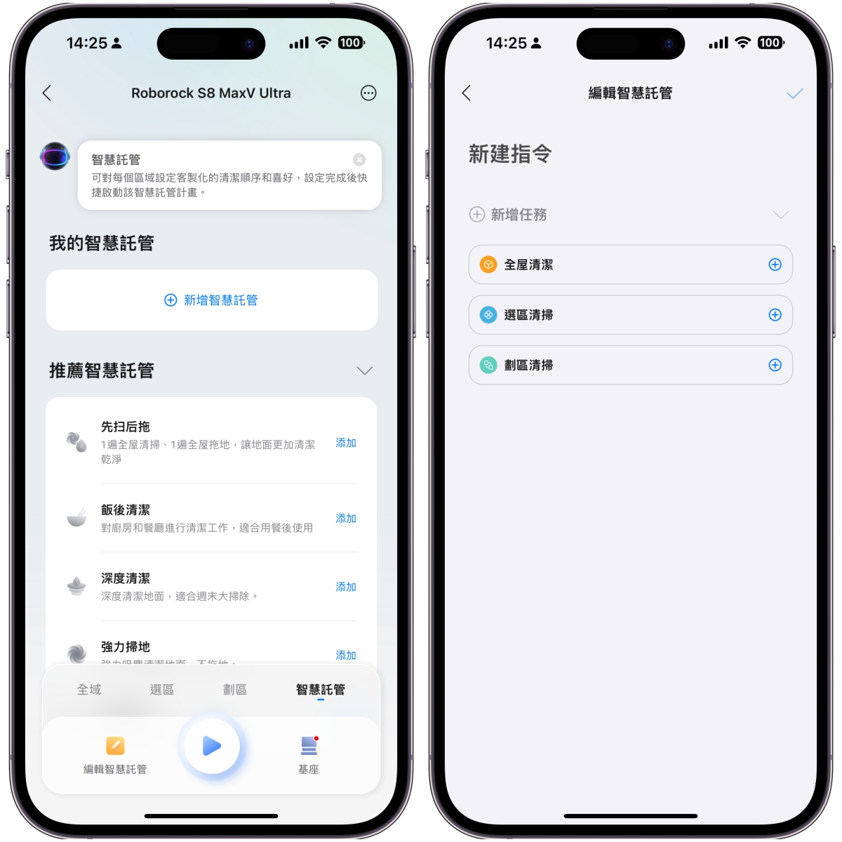 智慧托管的部份可以自由自訂清潔指令,針對每區域或是重點區域另外設定,即便你毛再多,都能應付你所有的需求。