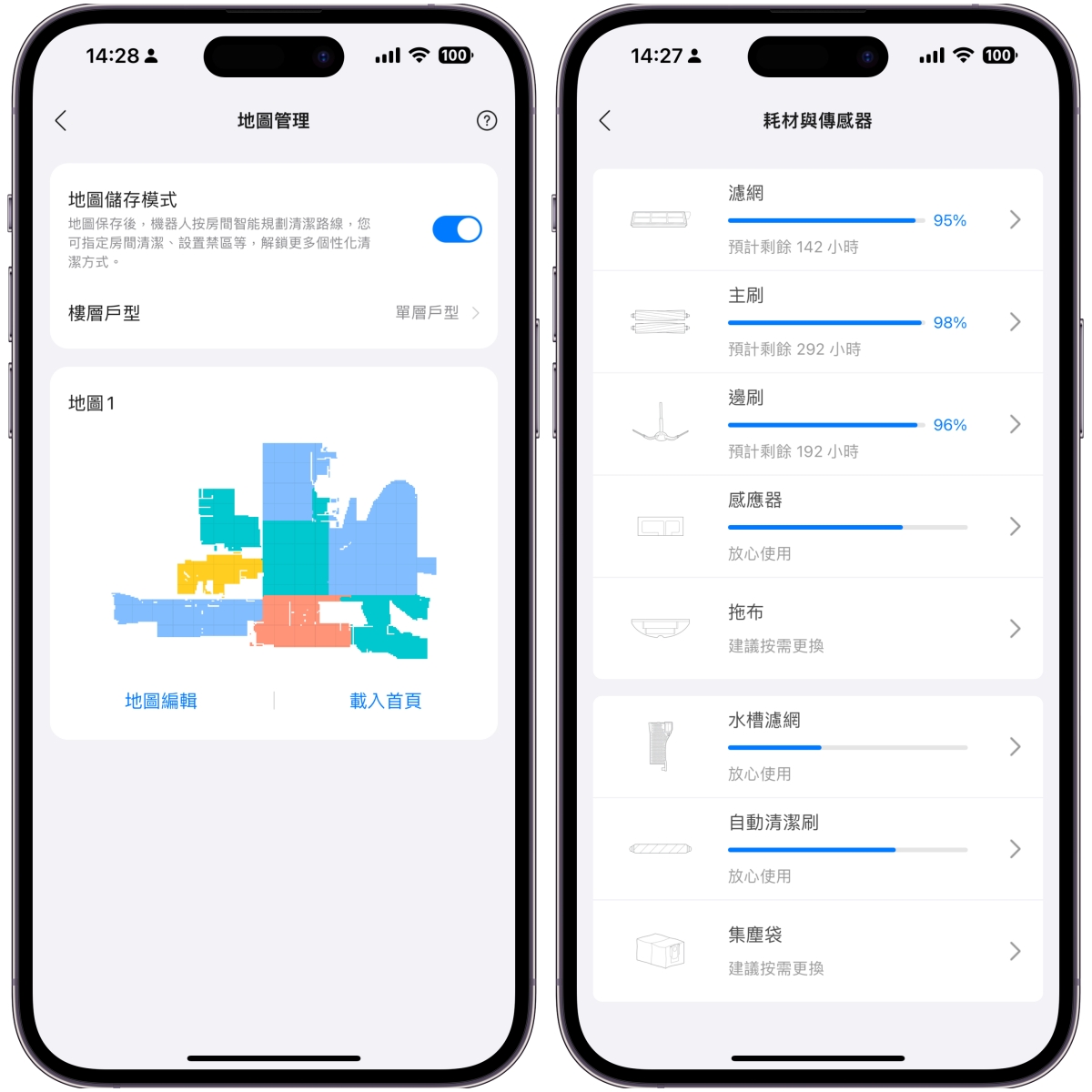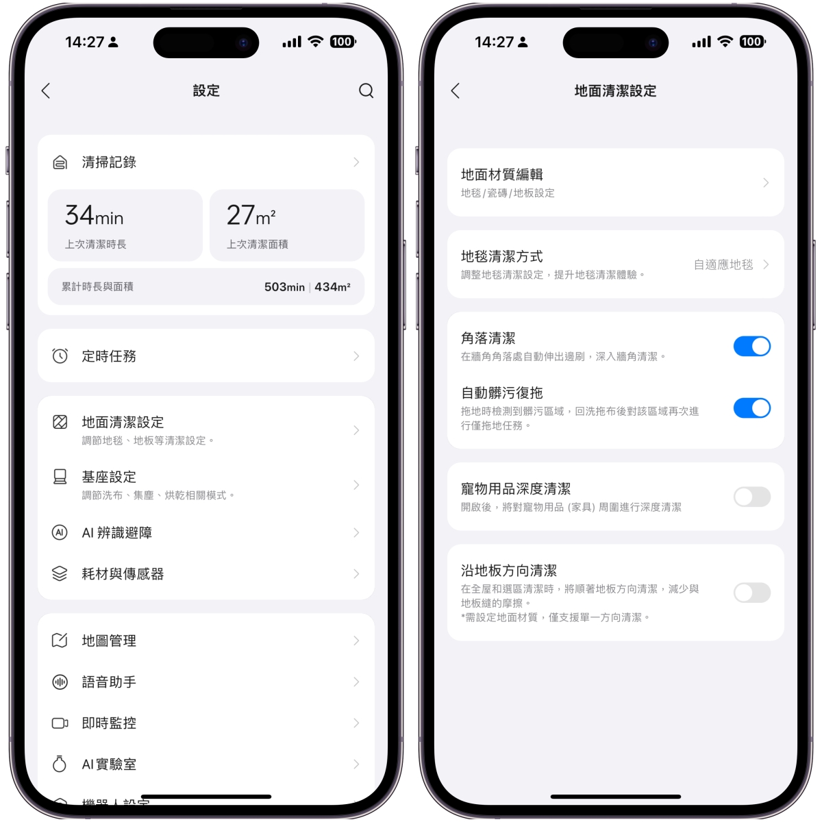 更多設定中也能查看清掃的記錄,設定定時清掃等,而家中如果對於地面材質有更多要求的話,可以在地面清潔設定裡針對材質進行編輯設定,另外也建議可以開啟自動髒汙復拖,我自己用下來,廚房很常自動拖二次,特別是煮完飯後。