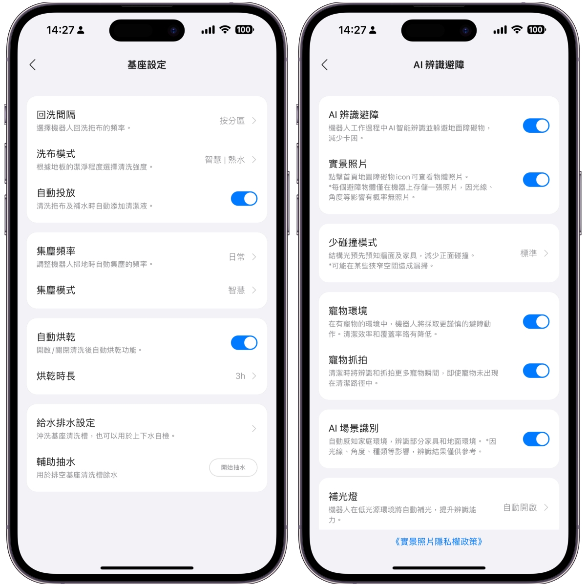基座相關設定裡還有給水排水設定,可以手動將水槽的水抽出,而 AI 辨識避障推薦大家可以開啟實景照片,這樣就算出門在外也能看實際清掃時遇到哪些障礙物。