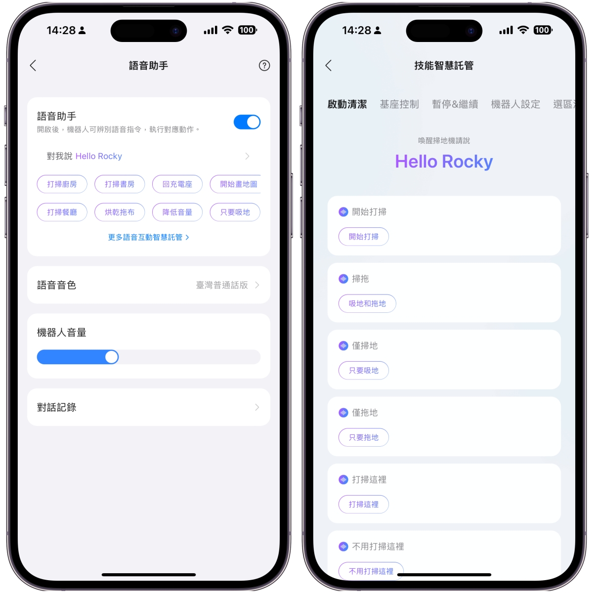 而去年石頭就加入的語音功能真的是讓我愛不釋手,以前常常在出門後想著要開啟掃地機,但一走出家門就忘記要打開手機的 App,現在就不會了,每次出門就是直接 Hello Rocky,開始打掃,就走了,煮完飯就是 Hello Rocky,打掃廚房,真的是太懶人了。