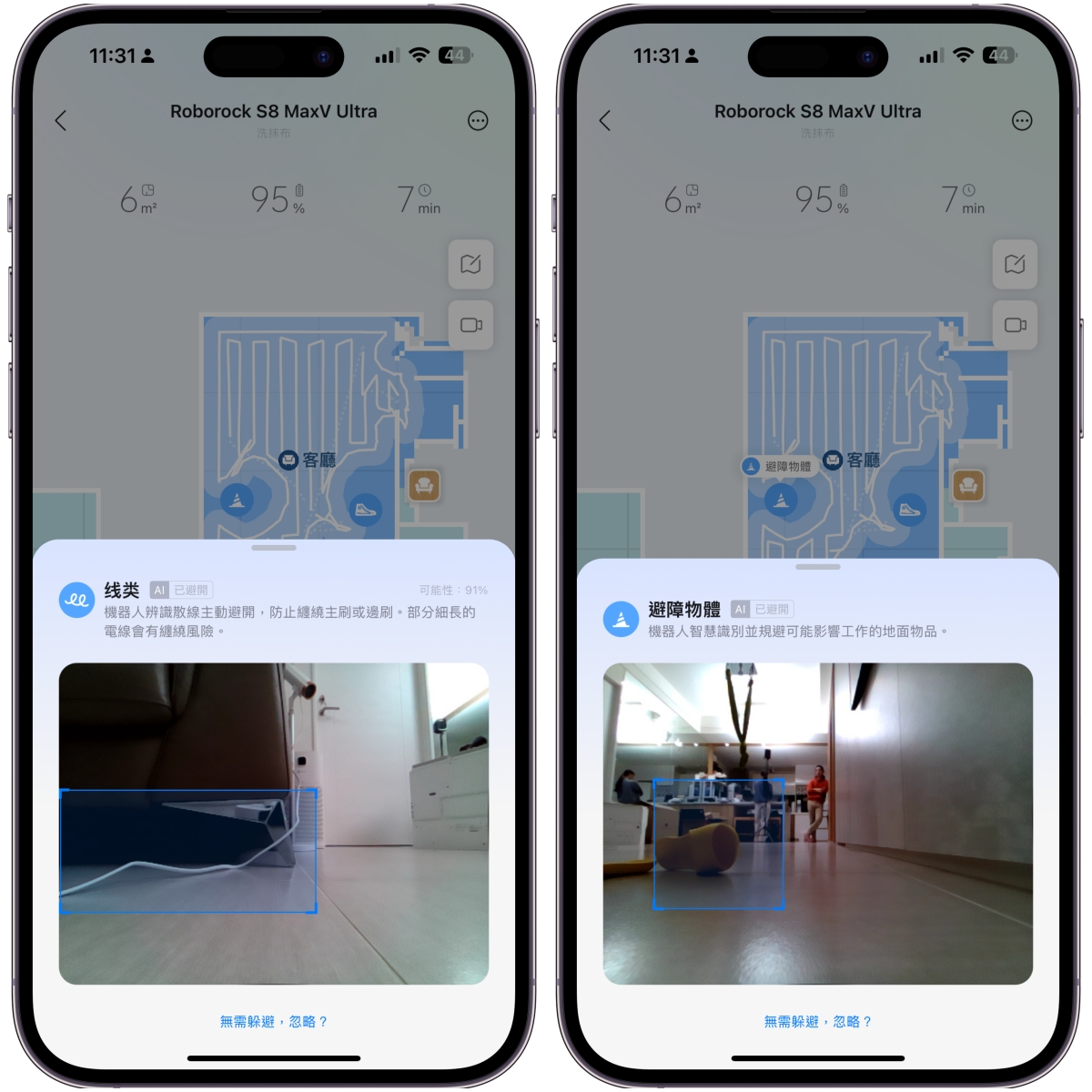 當你有開啟實景照片時,清掃時有偵測到障礙物都可以像這樣直接查看辨識到的是什麼,如果真的沒辨識出來的,至少你也可以知道什麼東西沒被避開,下次就可以先收拾好。